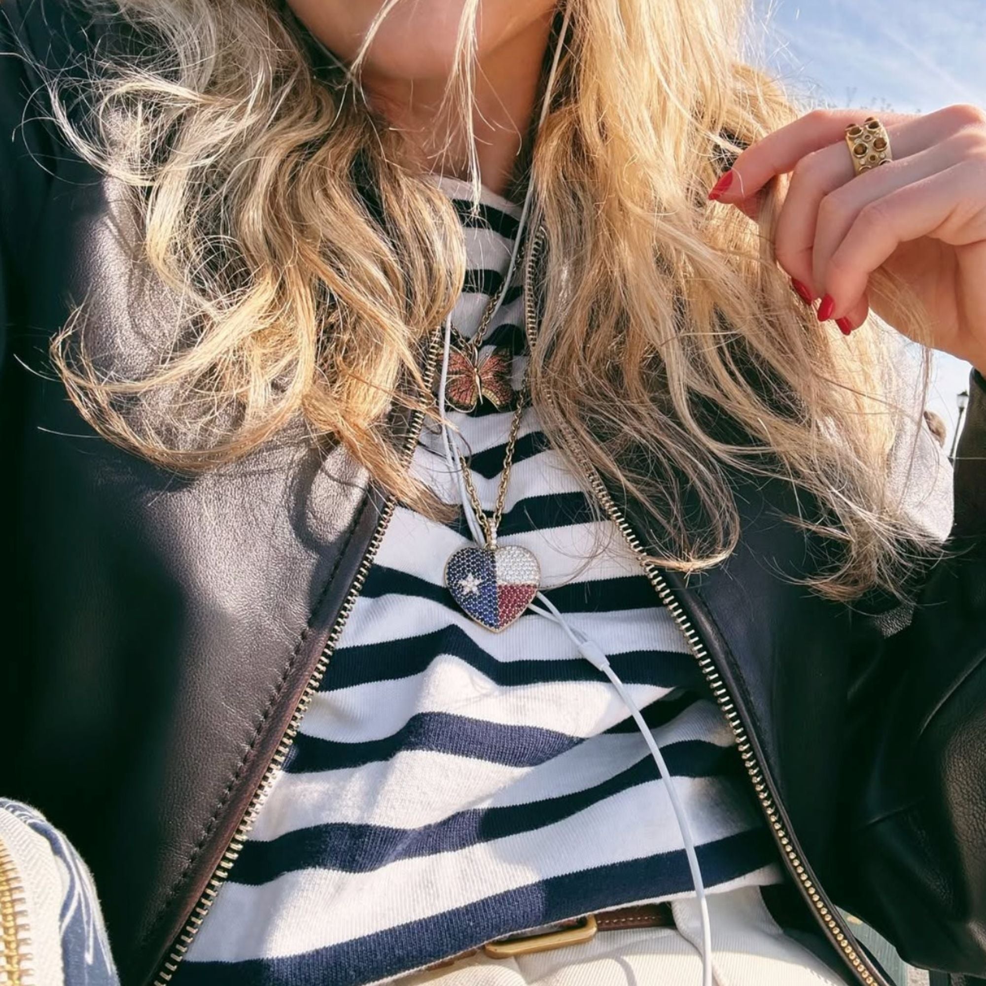 A 18k gold heart pendant inspired by Texas, set with blue sapphires, white diamonds, and rubies that trace the form in vivid color. Bold but refined, it balances state pride with fine detail, designed to sit close and feel personal.
