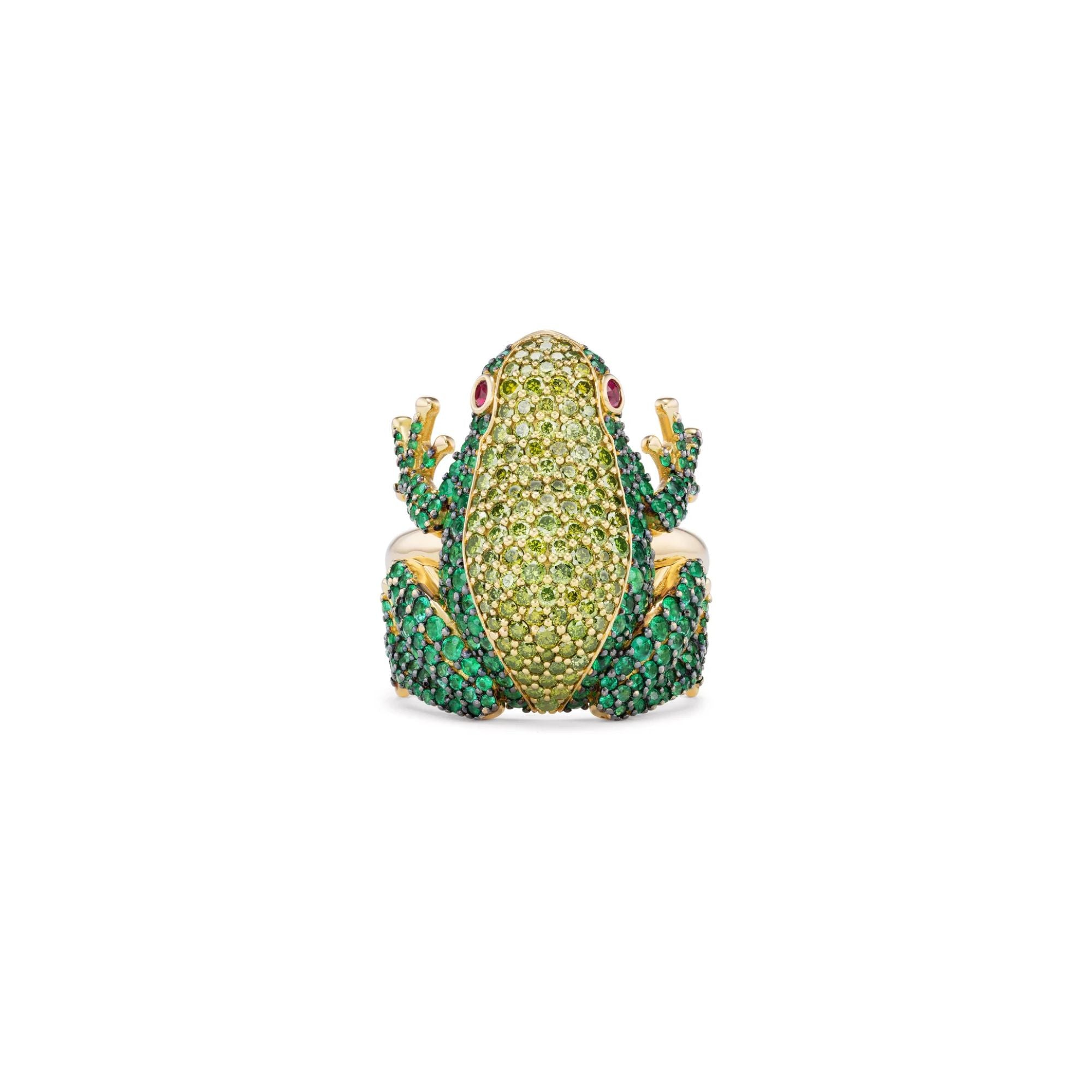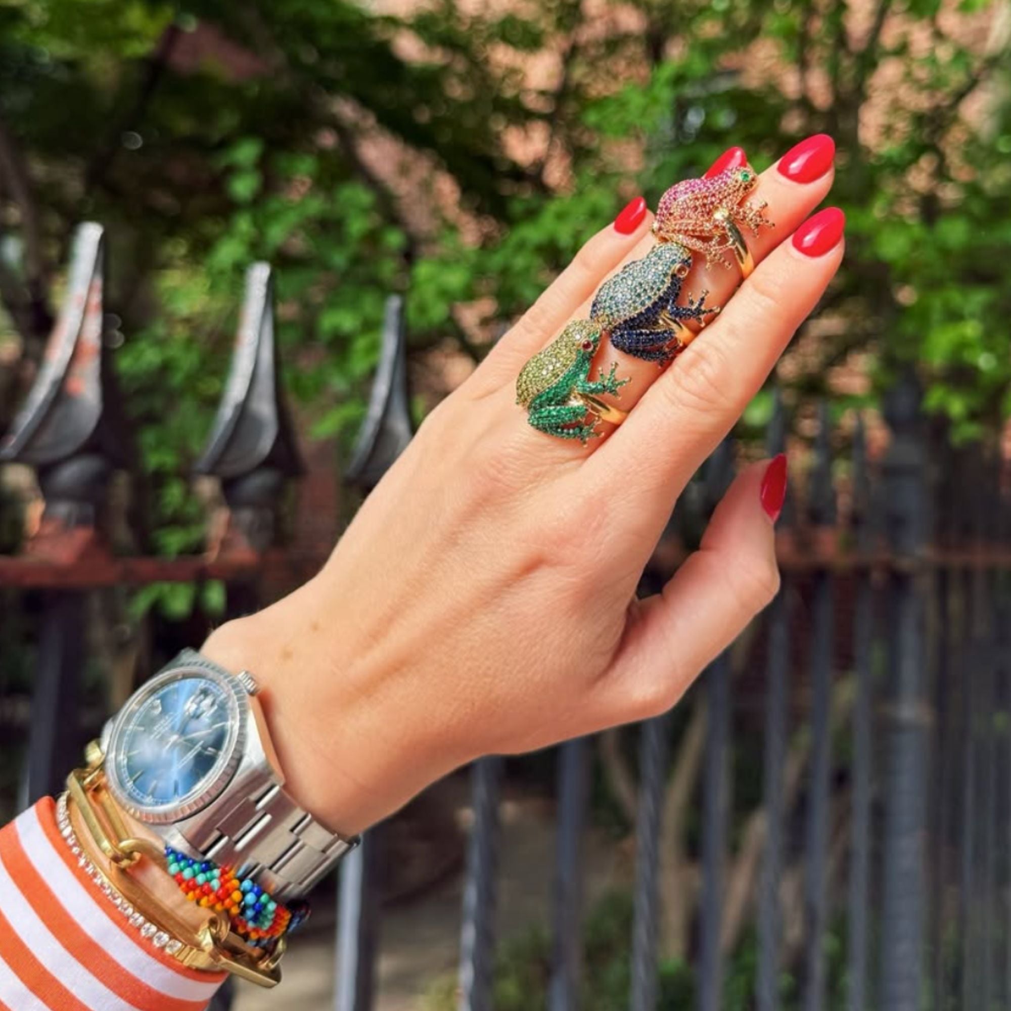 A small moment of whimsy, cast in 18k gold. This frog wraps gently around the finger, set with emeralds, green diamonds, and a hint of ruby for a subtle flash of color. Playful, a little unexpected, and easy to wear in that “why not?” way.