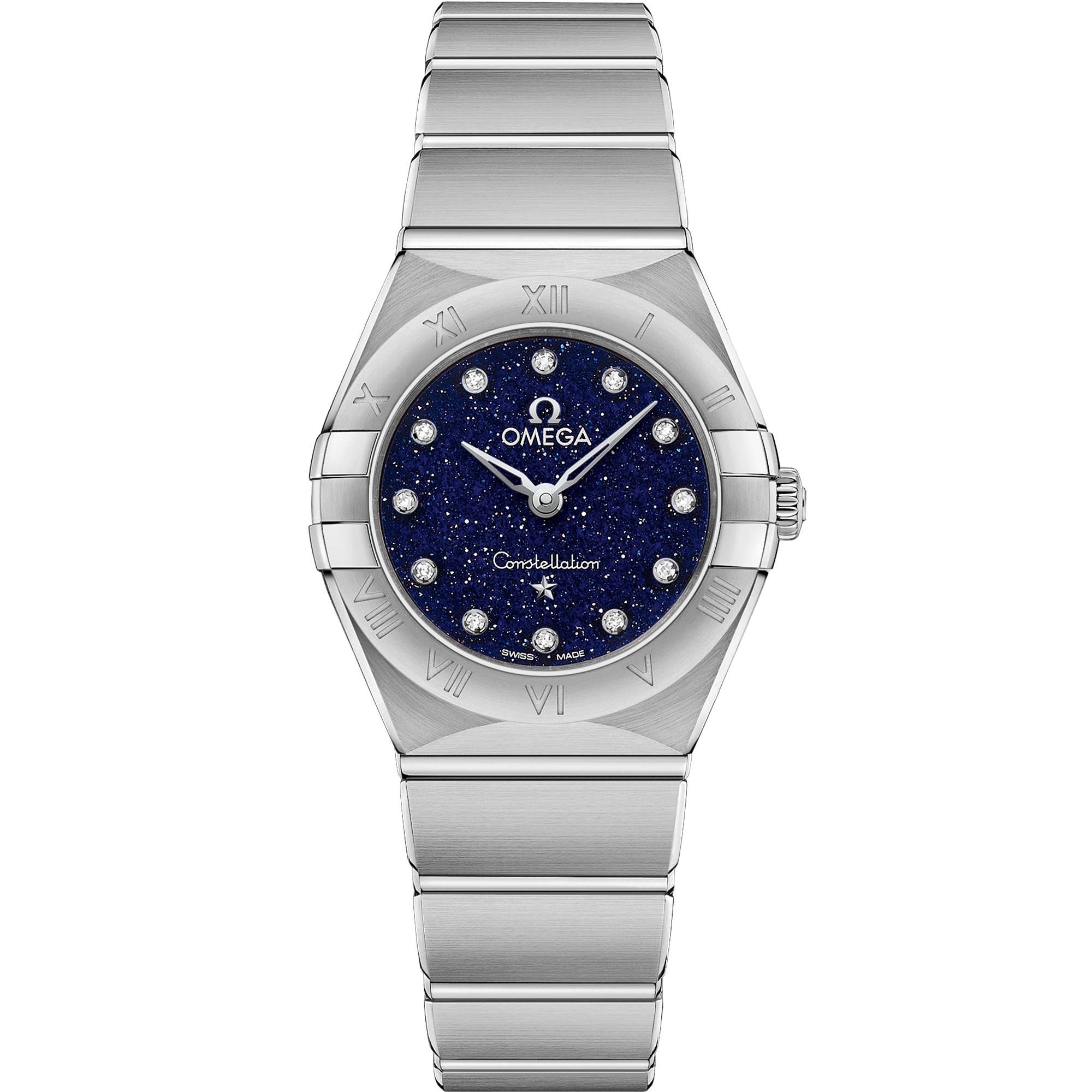 This 25 mm stainless steel model features a bezel with engraved Roman numerals and a blue aventurine glass dial with diamond hour markers. The hands, OMEGA logo, Constellation star and diamond holders are in 18K white gold.