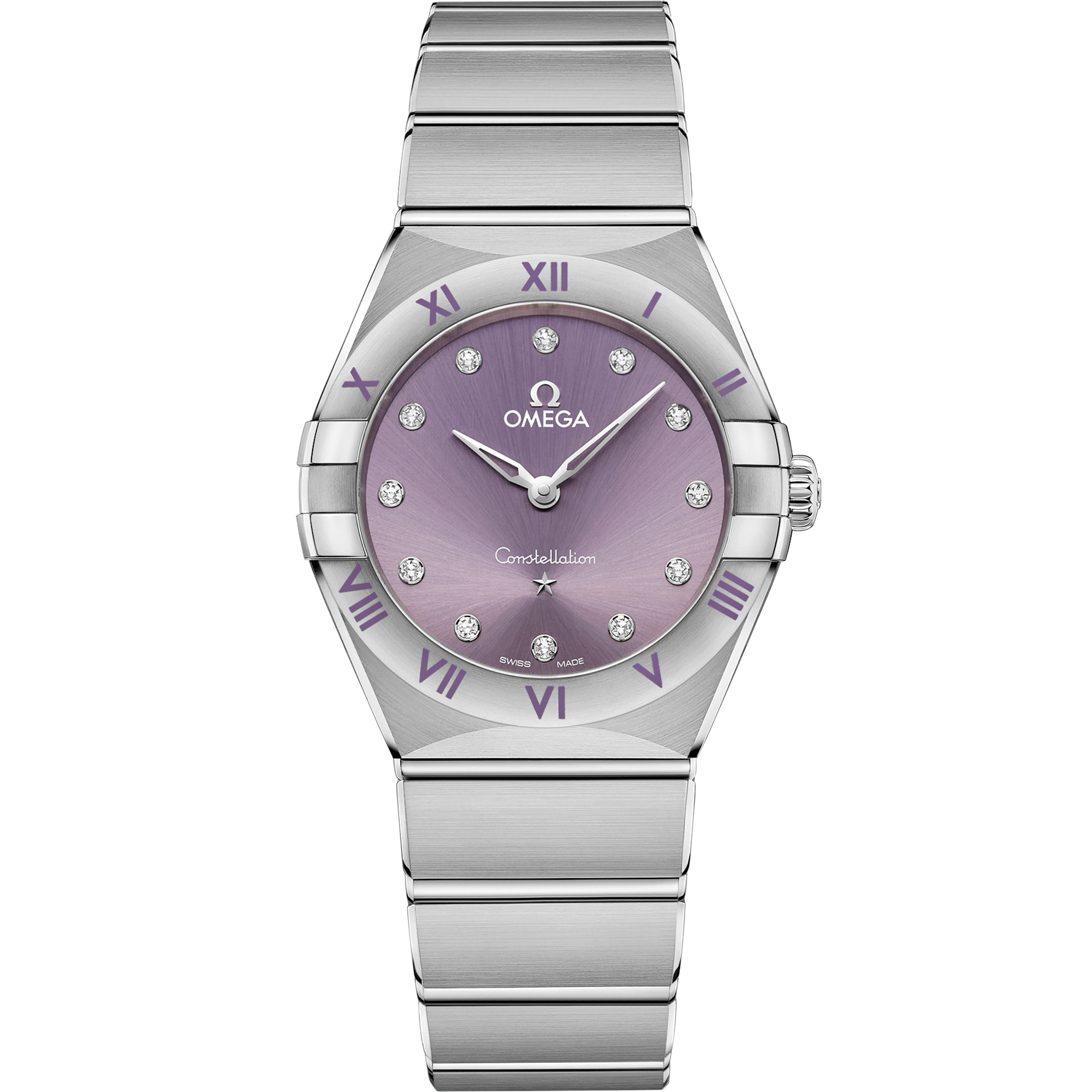 This 28 mm model, with case and bracelet in stainless steel, features indexes and applied elements in 18K white gold, set against a striking patchouli blossom dial.