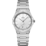 This 34 mm model in stainless steel features a bezel with engraved Roman Numerals, a crystal white silvery dial, and a round date window at the 6 o'clock position. The polished hour markers, hands, OMEGA logo and Constellation star are all in 18K white gold, while the Small Seconds subdial and Central Minute Track are circled by rings.