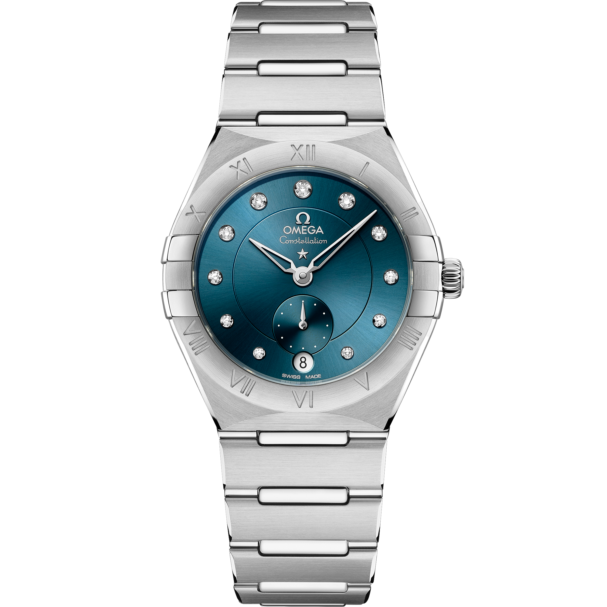 This 34 mm model in stainless steel features a bezel with engraved Roman Numerals, a sun-brushed peacock blue dial, and a round date window at the 6 o'clock position. The incremental diamond hour markers are presented in 18K white gold holders, while the Small Seconds subdial and Central Minute Track are circled by rings. The hands, OMEGA logo and Constellation star are also in 18K white gold.