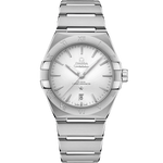 This 39 mm stainless steel model features a bezel engraved with Roman numerals, a sun-brushed silvery dial and a date window at the 6 o'clock position. The hands, OMEGA logo, Constellation star and indexes are all in 18K white gold.