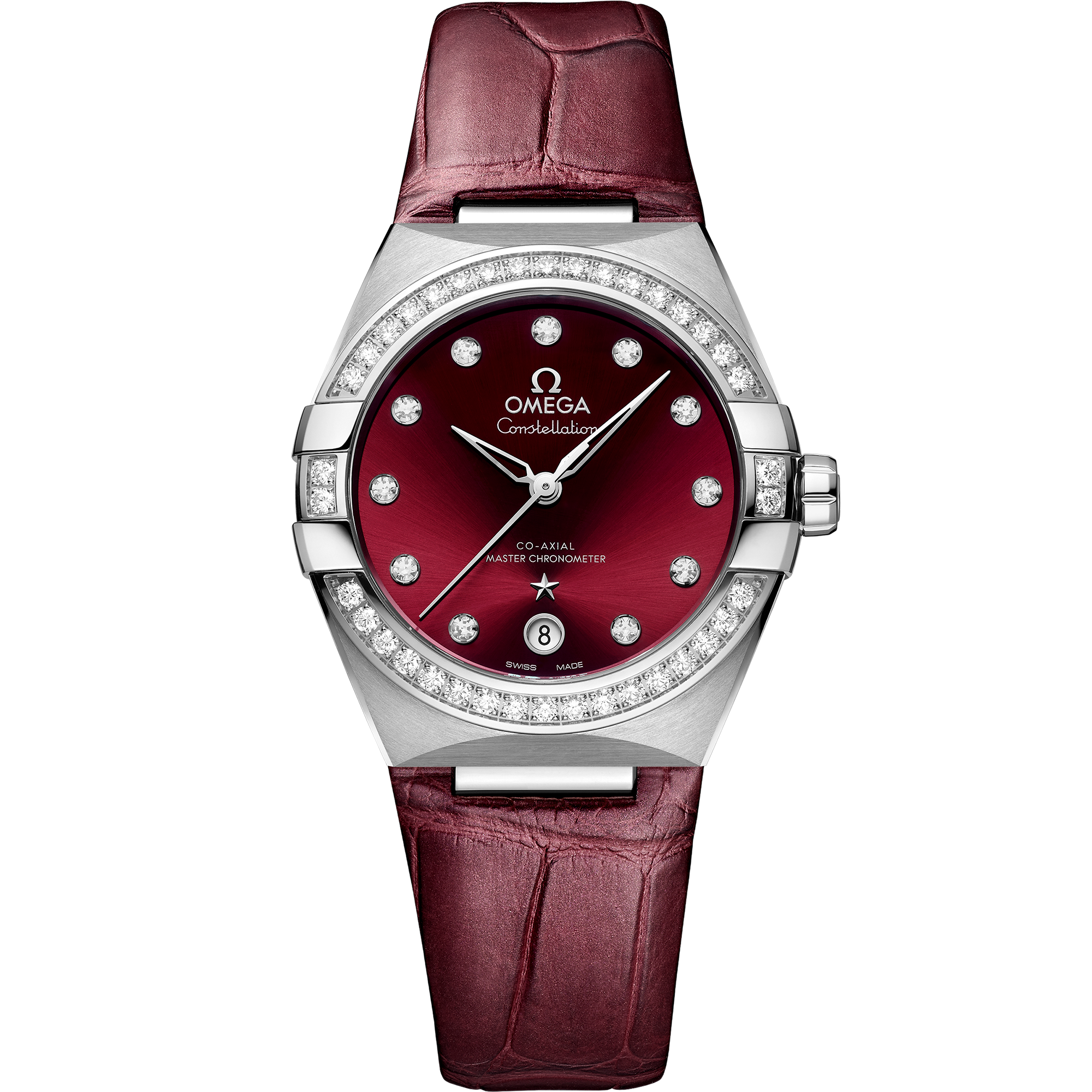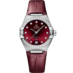 This 36 mm stainless steel model features a polished bezel set with 38 diamonds, a burgundy PVD treated dial with sun-brushed finish and a date window at the 6 o'clock position. The hands, OMEGA logo, Constellation star and indexes are all in 18K white gold.
