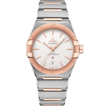 This 39 mm stainless steel and 18K Sedna™ gold model features a bezel engraved with Roman numerals, an opaline white silvery dial and a date window at the 6 o'clock position. The hands, OMEGA logo, Constellation star and indexes are all in 18K Sedna™ gold.