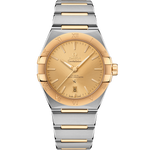 This 39 mm stainless steel and 18K yellow gold model features a bezel engraved with Roman numerals, a sun-brushed champagne dial and a date window at the 6 o'clock position. The hands, OMEGA logo, Constellation star and indexes are all in 18K yellow gold.