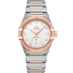 This 39 mm stainless steel and 18K Sedna™ gold model features a bezel engraved with Roman numerals, an opaline white silvery dial with diamond indexes and a date window at the 6 o'clock position. The hands, OMEGA logo, Constellation star and diamond holders are all in 18K Sedna™ gold.