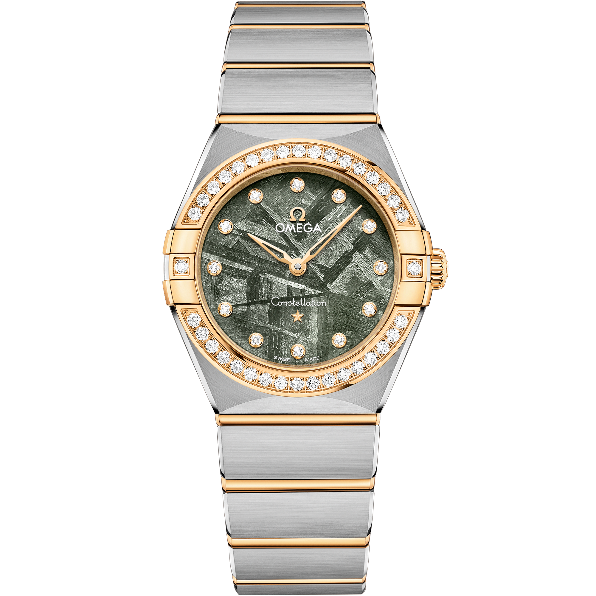 The astonishing dial is formed from a genuine piece of iron meteorite, which has been given a green colour treatment. The natural pattern within the meteorite is unique to each model, meaning that no two dials are ever the same. It is completed with diamond hour markers, and a Constellation star in 18K yellow gold.