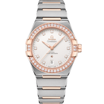 This 39 mm stainless steel and 18K Sedna™ gold model features a diamond-paved bezel, an opaline silvery dial with diamond hour-markers and a date window at the 6 o'clock position. The hands, OMEGA logo, Constellation star and diamond-holders on the dial are all in 18K Sedna™ gold.