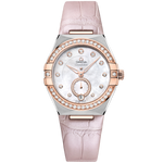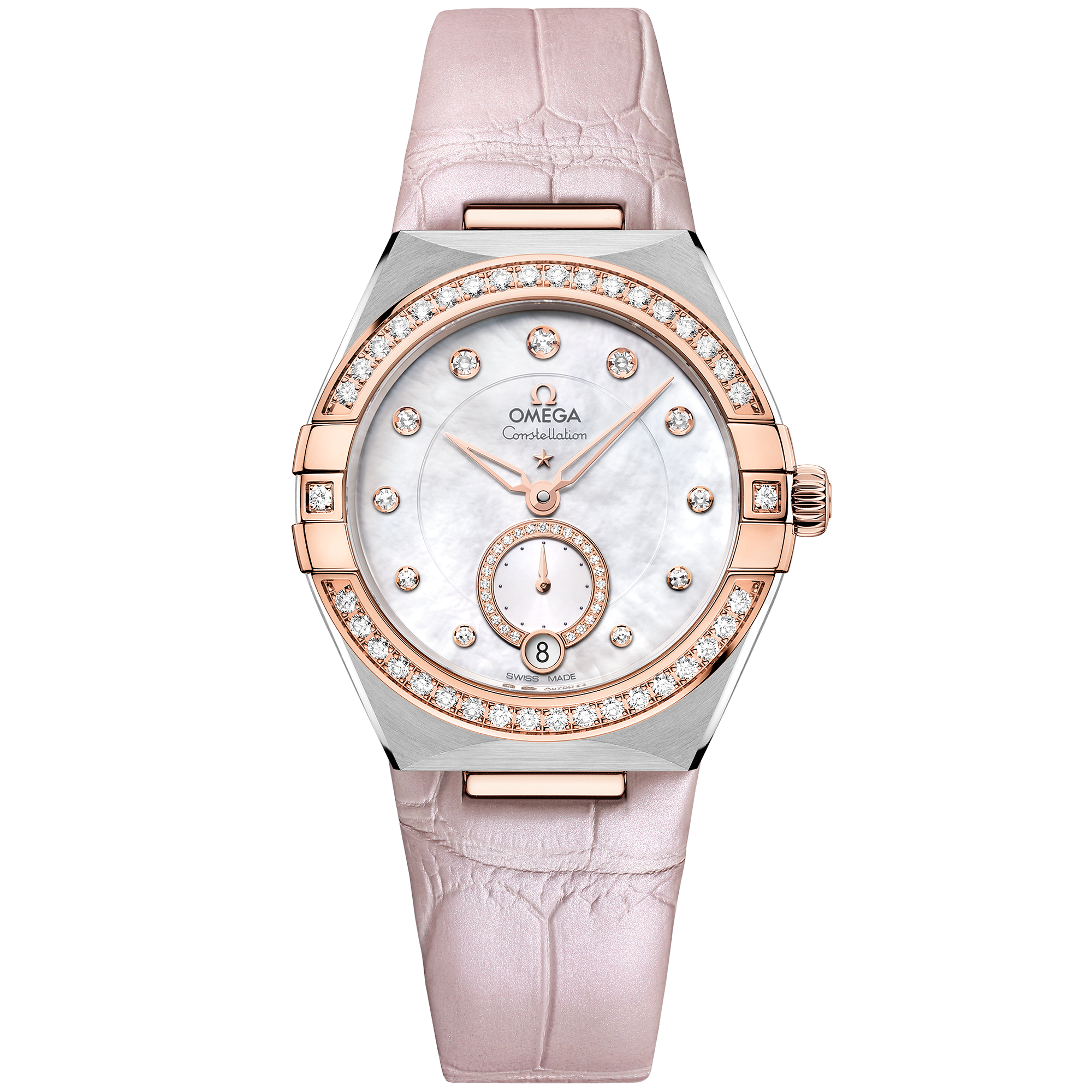 Presented on a light pink leather strap, the timepiece is driven by the OMEGA Co-Axial Master Chronometer Calibre 8802, visible through the domed scratch-resistant sapphire crystal.