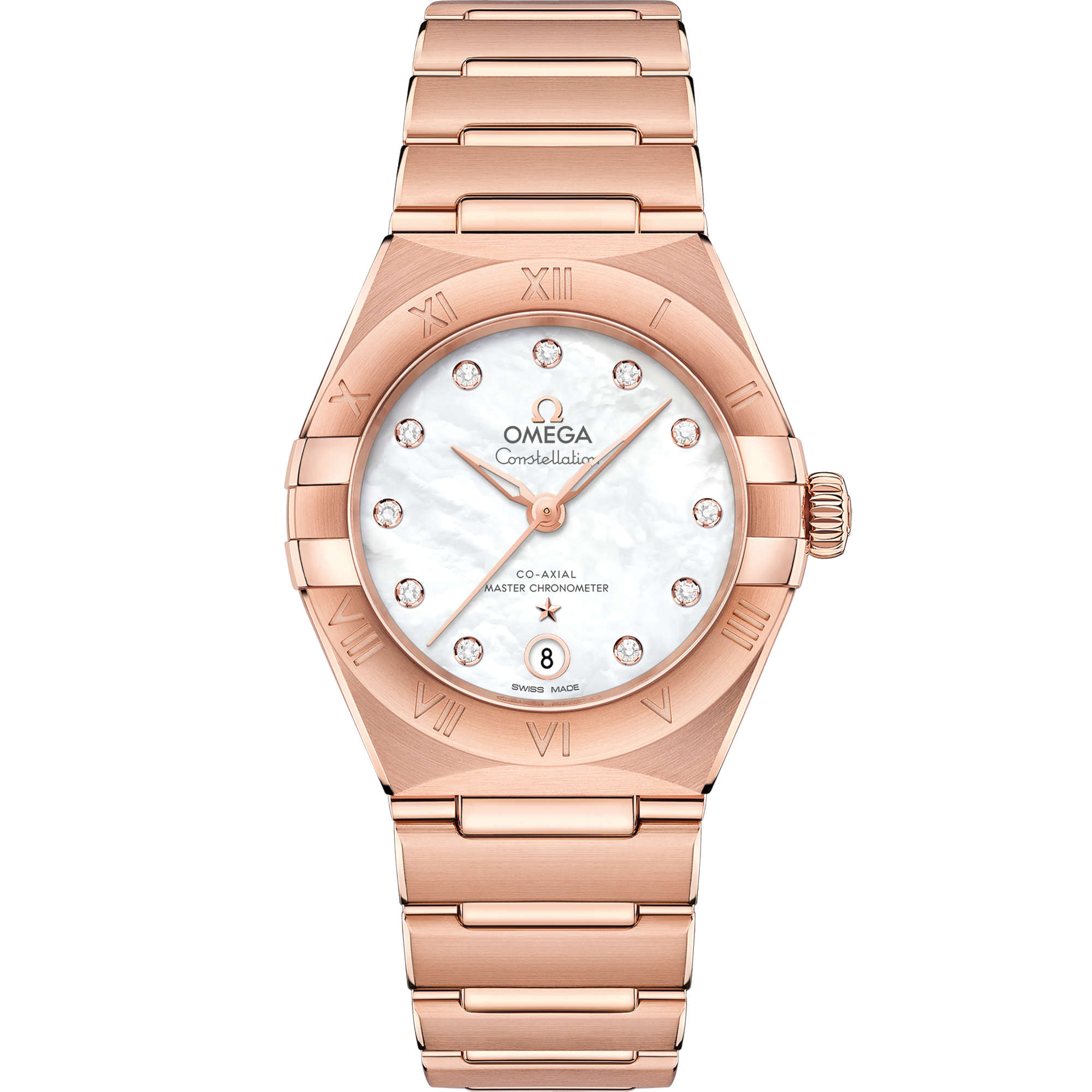 This 29 mm 18K Sedna™ gold model features a bezel engraved with Roman numerals, pearled mother-of-pearl dial with diamond hour markers and a date window at the 6 o'clock position. The bracelet, hands, OMEGA logo, Constellation star and diamond holders are also in 18K Sedna™ gold.
