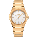 This 39 mm 18K yellow gold model features a bezel engraved with Roman numerals, an opaline white silvery dial and a date window at the 6 o'clock position. The hands, OMEGA logo, Constellation star and indexes are all in 18K yellow gold.