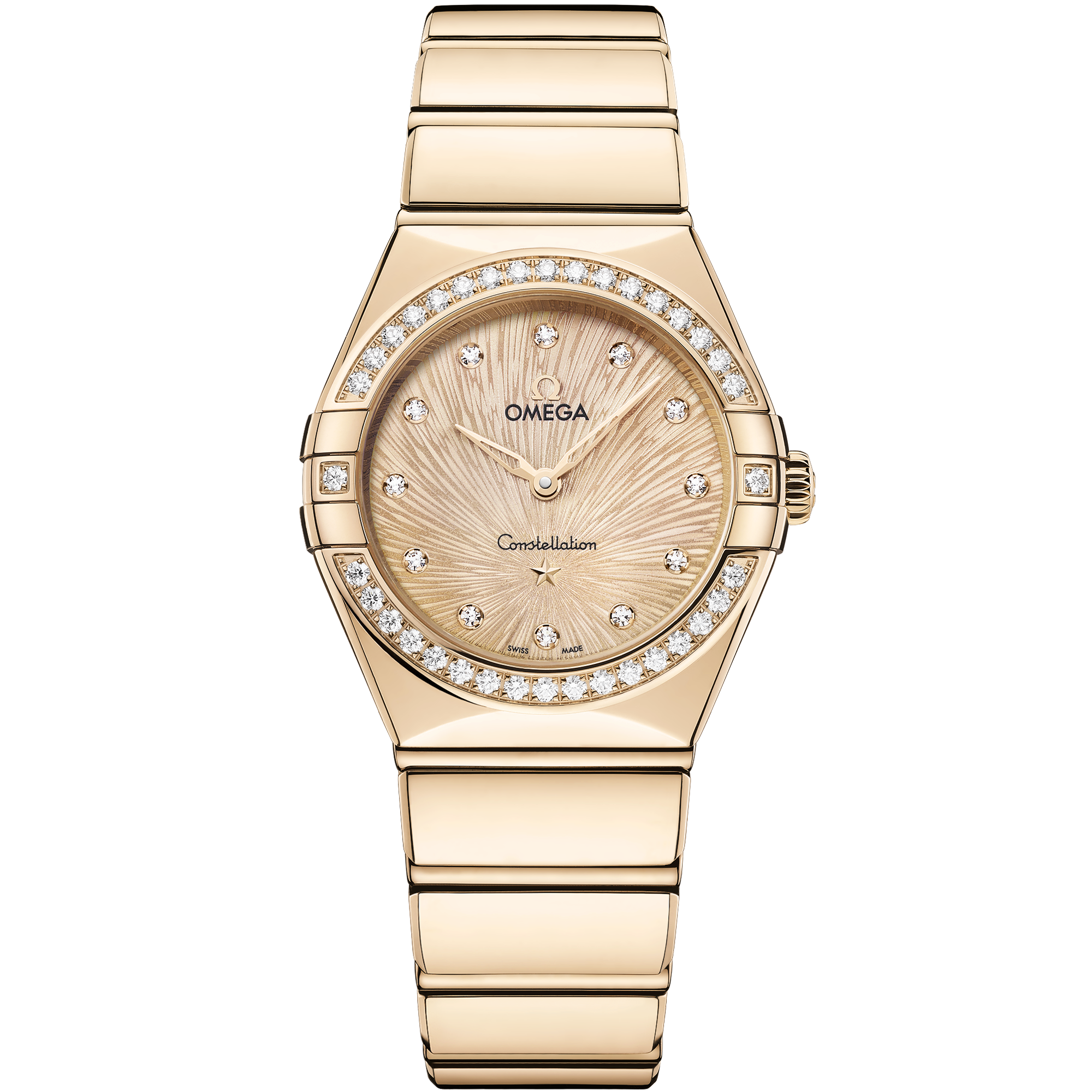 This 28 mm model is crafted in 18K Moonshine™ Gold, and features a radiant diamond-paved bezel. The PVD Moonshine™ Gold dial has been given a distinctive Supernova pattern through electrochemical etching, while other details include 18K Moonshine™ Gold hands and star, and diamond hour markers in 18K Moonshine™ Gold holders.