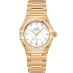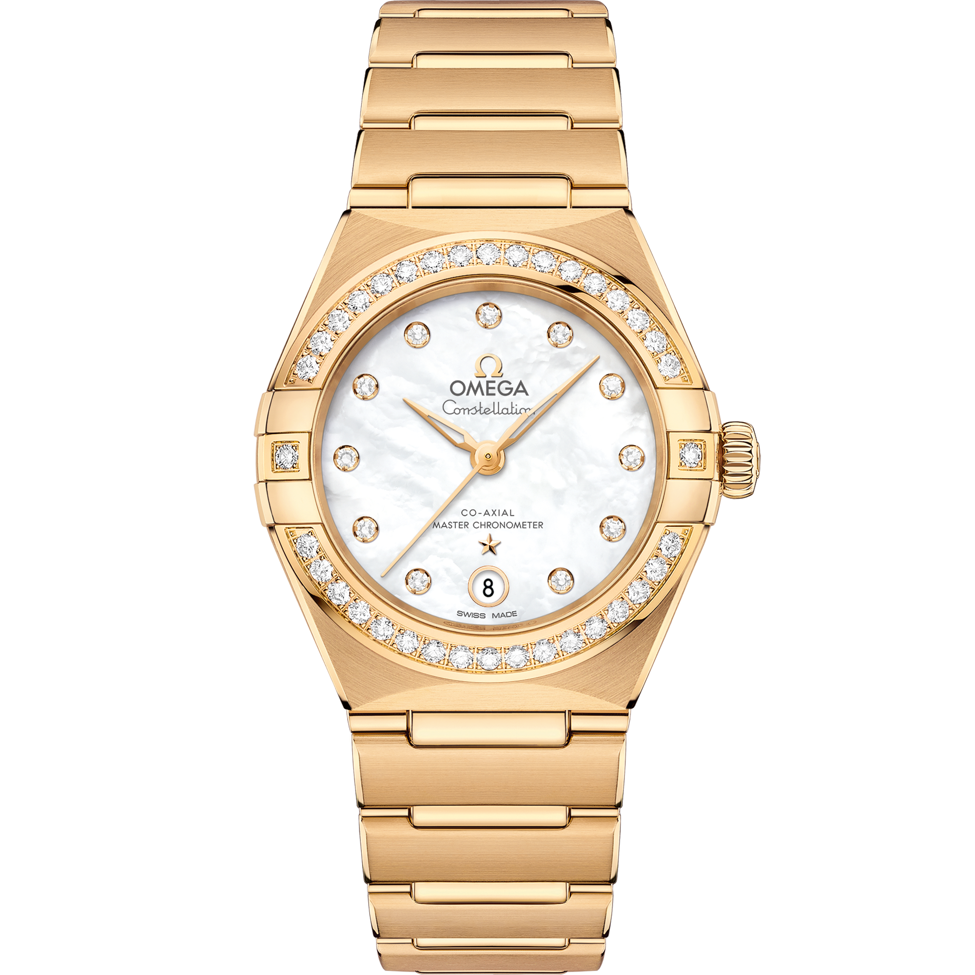 This 29 mm 18K yellow gold model features a diamond-paved bezel, pearled mother-of-pearl dial with diamond hour markers and a date window at the 6 o'clock position. The bracelet, hands, OMEGA logo, Constellation star and diamond holders are also in 18K yellow gold.