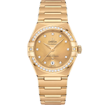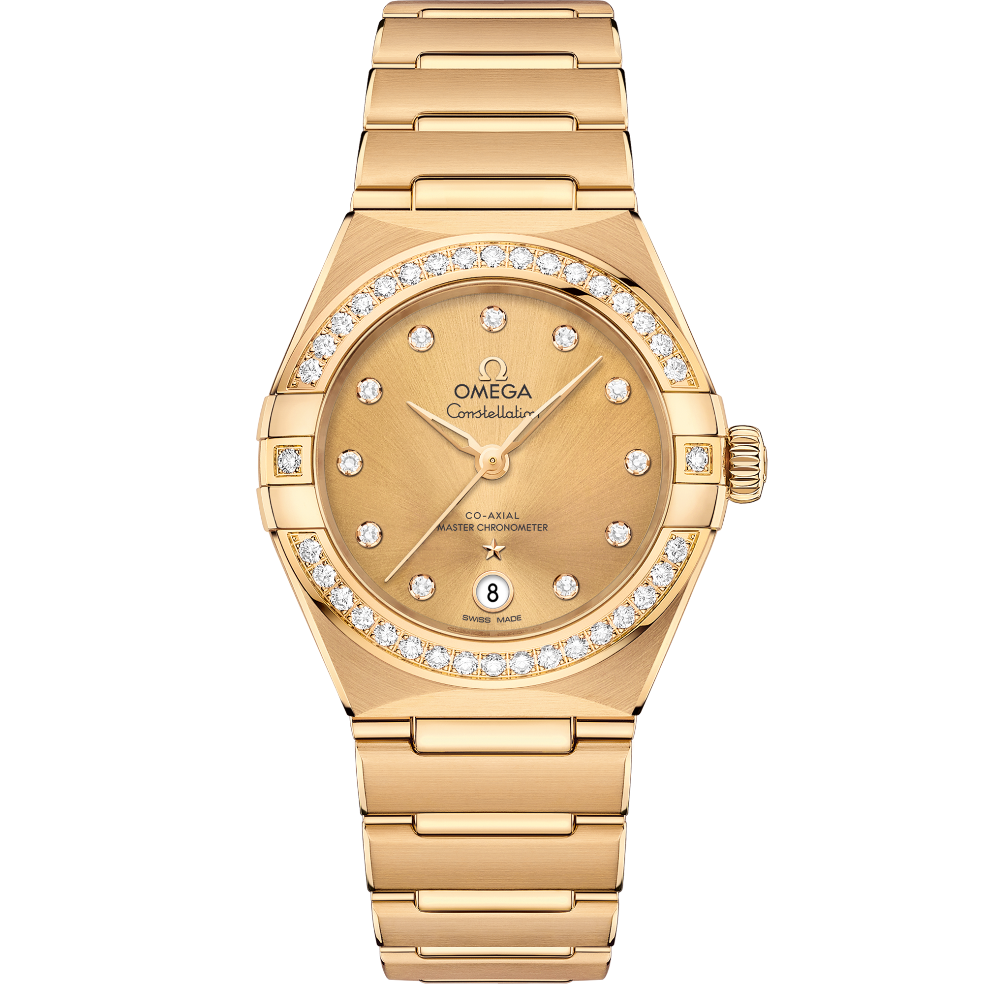 This 29 mm 18K yellow gold model features a diamond-paved bezel, sun-brushed champagne dial with diamond hour markers and a date window at the 6 o'clock position. The bracelet, hands, OMEGA logo, Constellation star and diamond holders are also in 18K yellow gold.