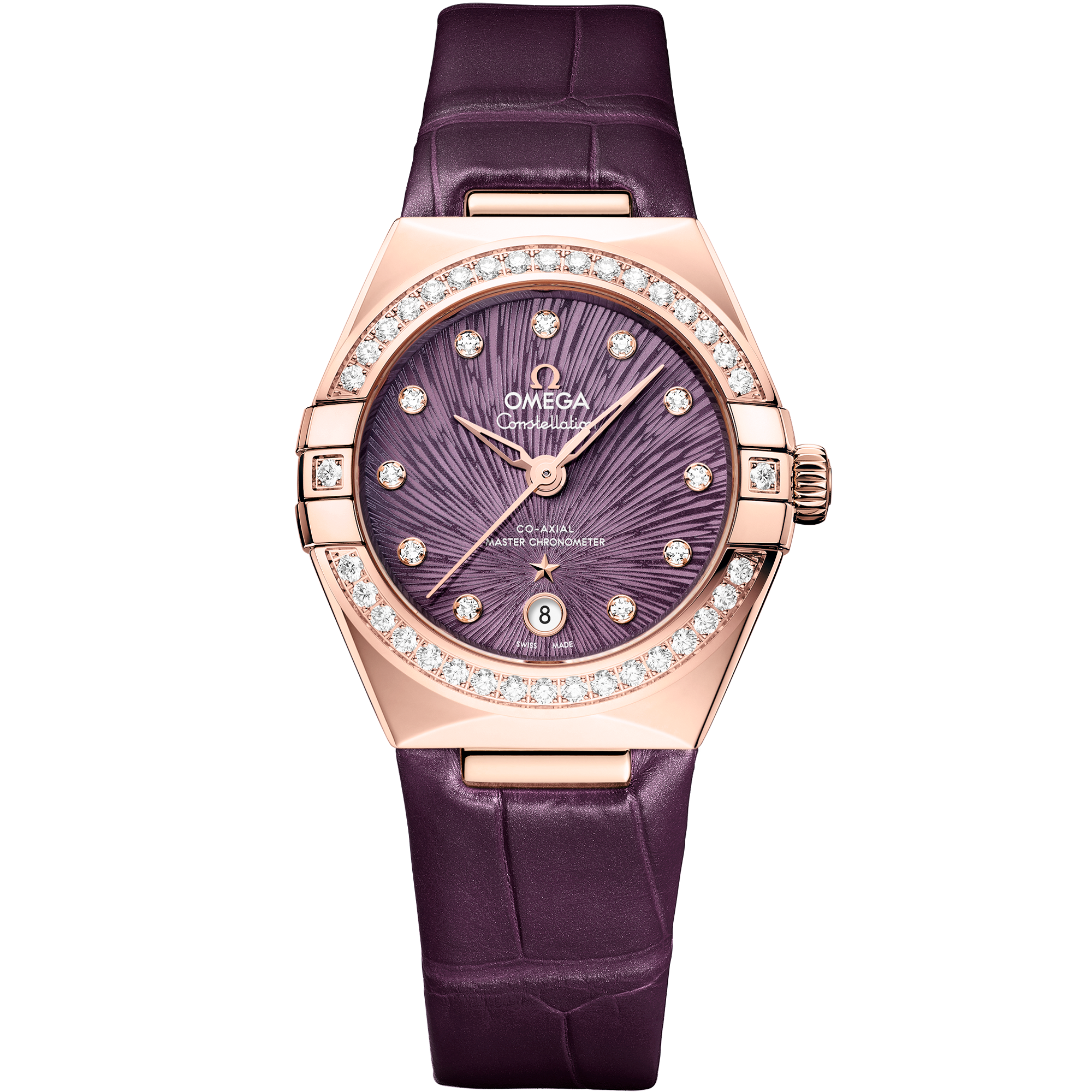 The watch is presented on a shimmering purple leather strap, and is powered by the OMEGA Co-Axial Master Chronometer Calibre 8701, which is visible through the sapphire crystal caseback.