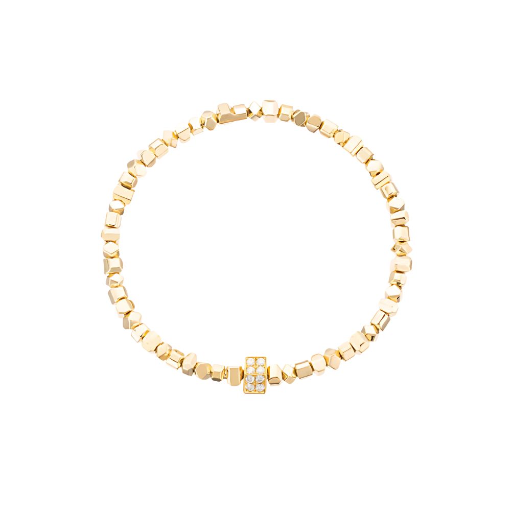 The Rocks Candy Mini Bracelet features elastic 18k yellow gold with moving, multi-faceted elements and 0.38ct of round brilliant diamonds. A bold, dynamic piece with a touch of sparkle.