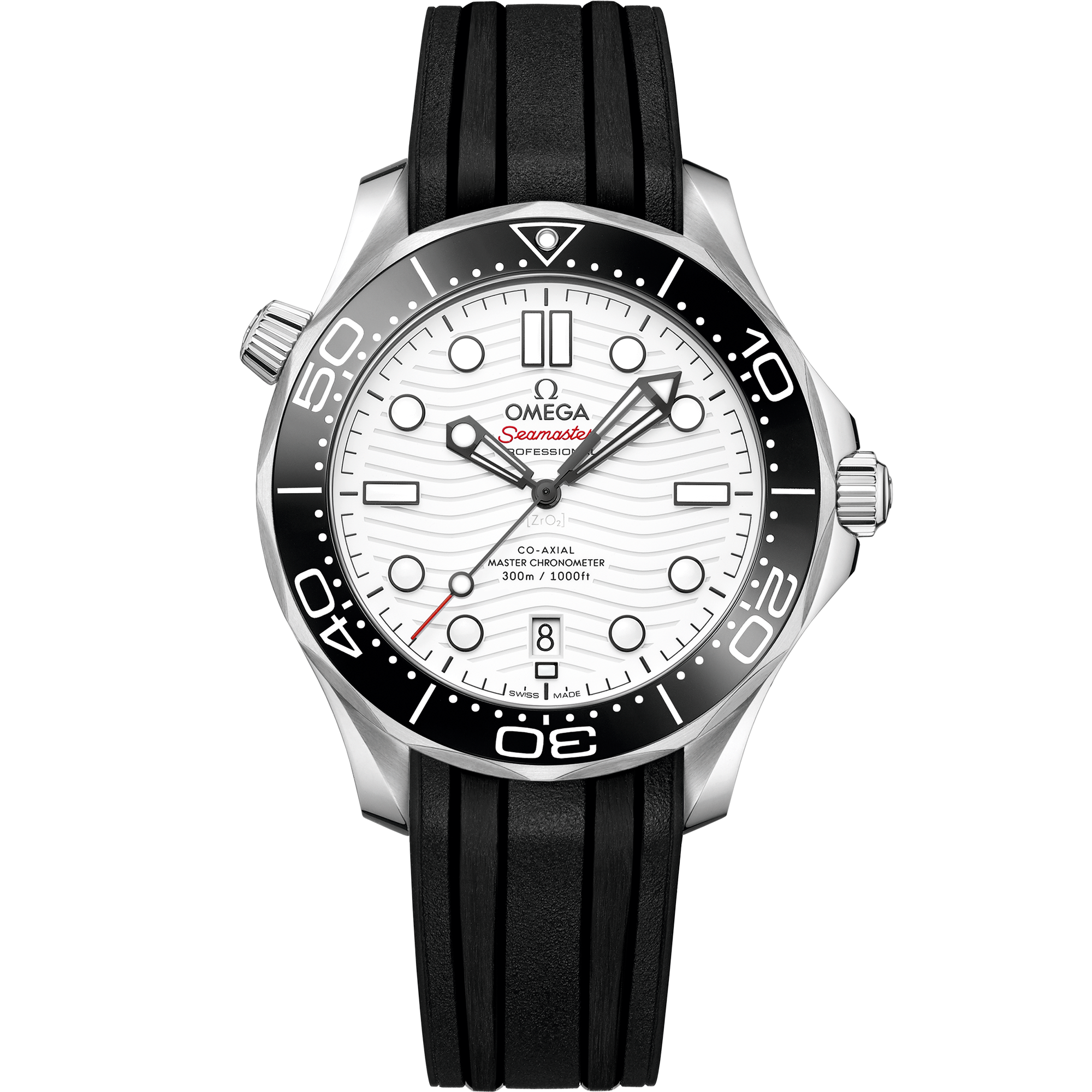 This 42 mm model is crafted from stainless steel and includes a black ceramic bezel with a white enamel diving scale. The dial is polished white ceramic and features laser-engraved waves and Seamaster highlighted in red.