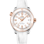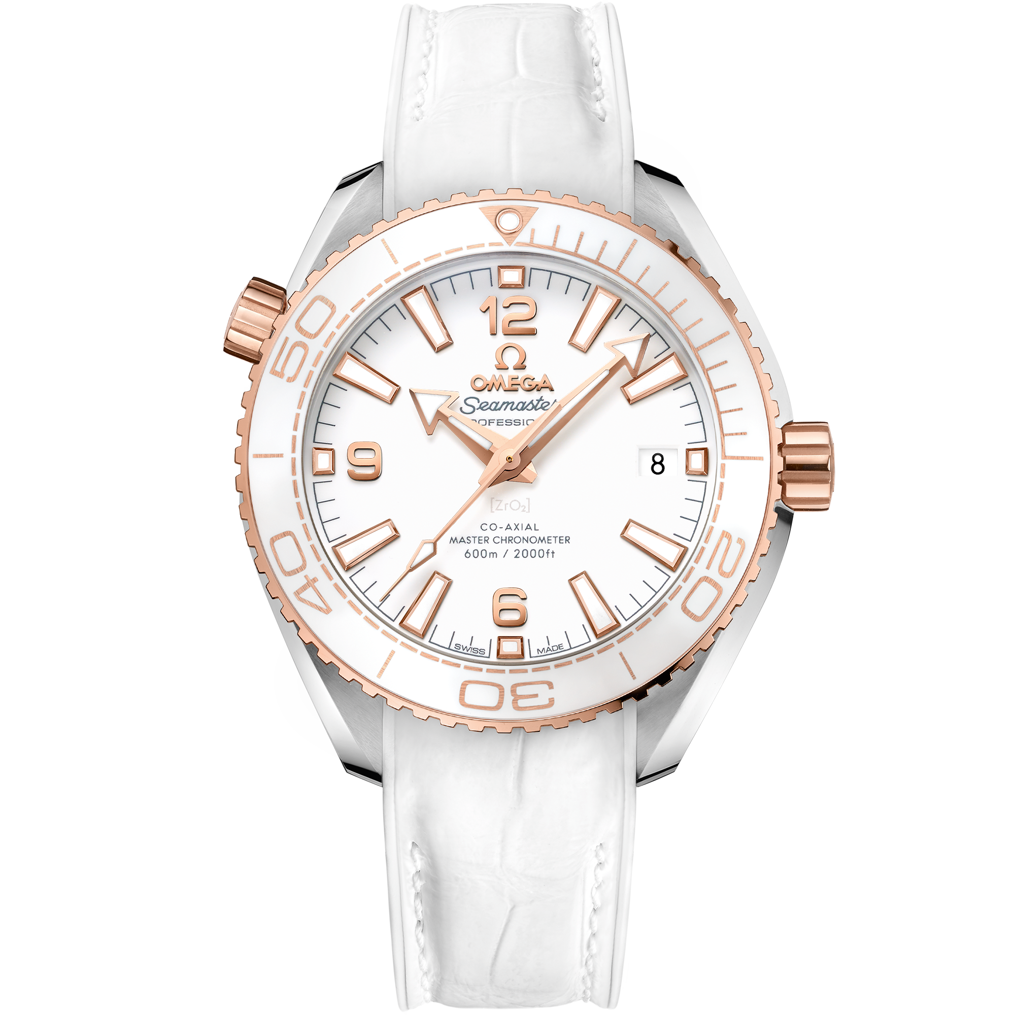 This model, with its scratch-resistant sapphire crystal, features a white ceramic dial with Arabic numerals and a date window at the 3 o’clock position. The white ceramic unidirectional bezel with OMEGA Ceragold™ diving scale is mounted on a 39.5 mm stainless steel and 18K Sedna™ gold case.