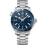 This model, with its scratch-resistant sapphire crystal, features a blue ceramic dial with Arabic numerals and a date window at the 3 o’clock position. The blue ceramic unidirectional bezel with OMEGA Liquidmetal™ diving scale is mounted on a 39.5 mm stainless steel case.