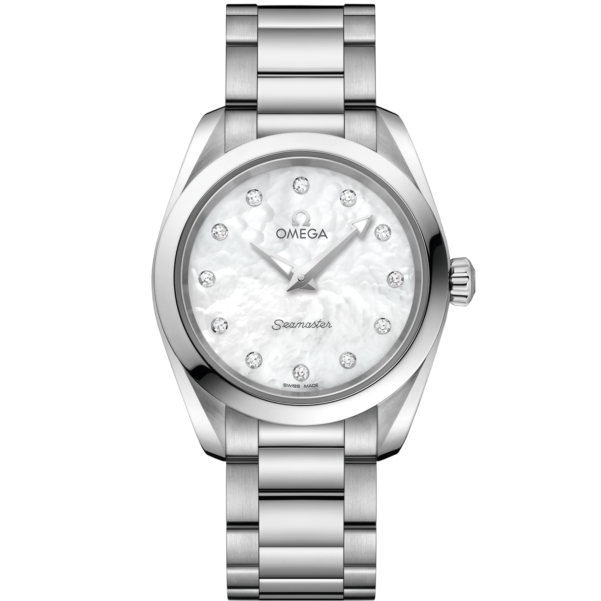 With a symmetrical 28 mm case, this stainless steel model features a white pearled mother-of-pearl dial and 12 diamond indexes in rhodium-plated holders. The hands are also rhodium-plated and the caseback is embossed with the OMEGA Seahorse on a wavy background.