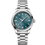 The lagoon green dial, fashioned from brass, is lacquered and sun-brushed from the centre. The date window at 6 o'clock, hands, indexes and OMEGA logo are in diamond-polished 18K white gold.