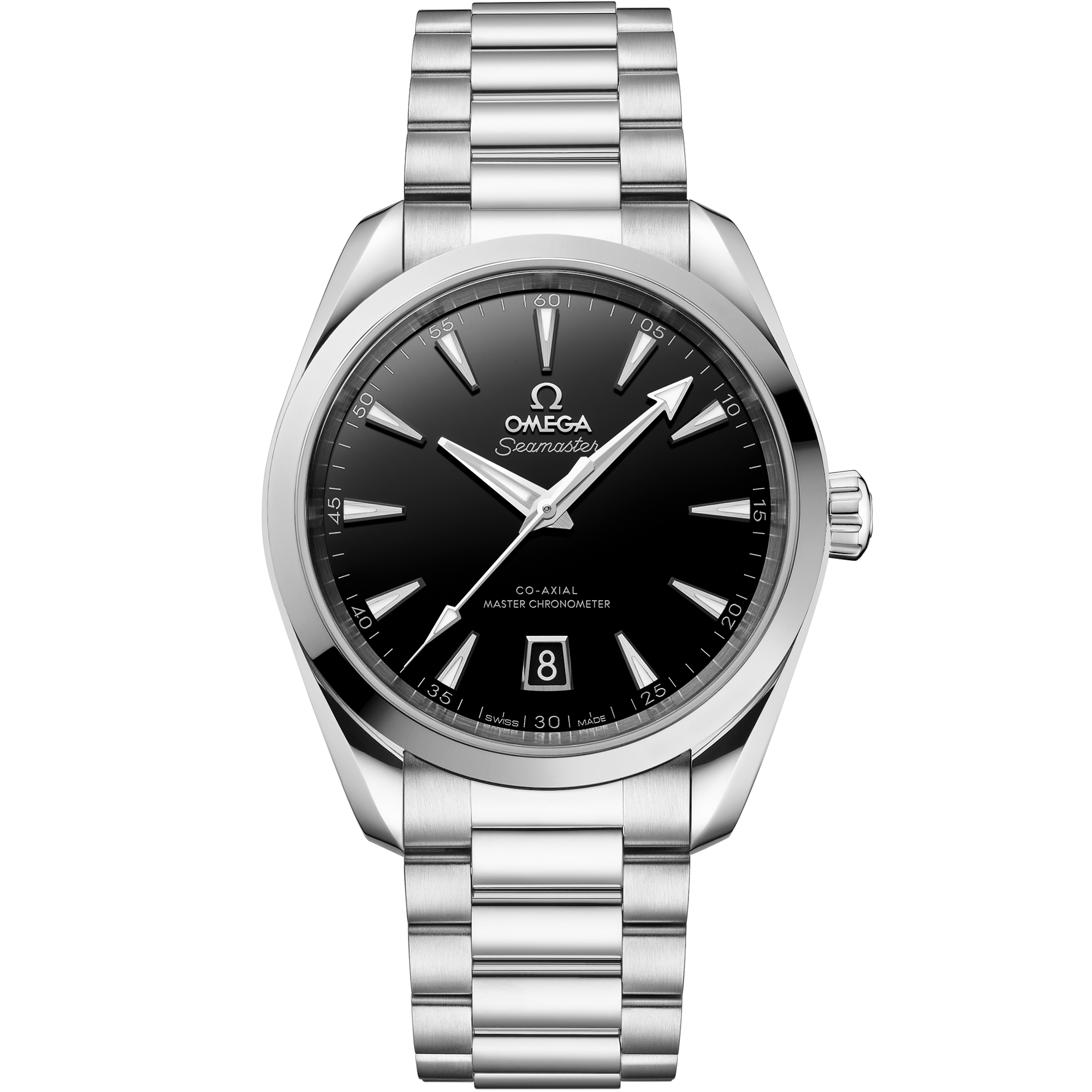 It has a lacquered black varnish dial with rhodium-plated diamond-polished OMEGA logo, and date window at 6 o'clock. The hands and hour markers, also rhodium-plated, are filled with white Super-LumiNova which emits a blue glow.