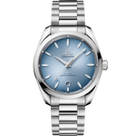 The sun-brushed dial, in OMEGA’s own Summer Blue, is PVD-treated and varnished with a gradient finish to reflect the watch’s level of water resistance. It has rhodium-plated hands and sailboat hull indexes filled with a unique light blue Super-LumiNova and a matching blue date window indicator at 6 o’clock.