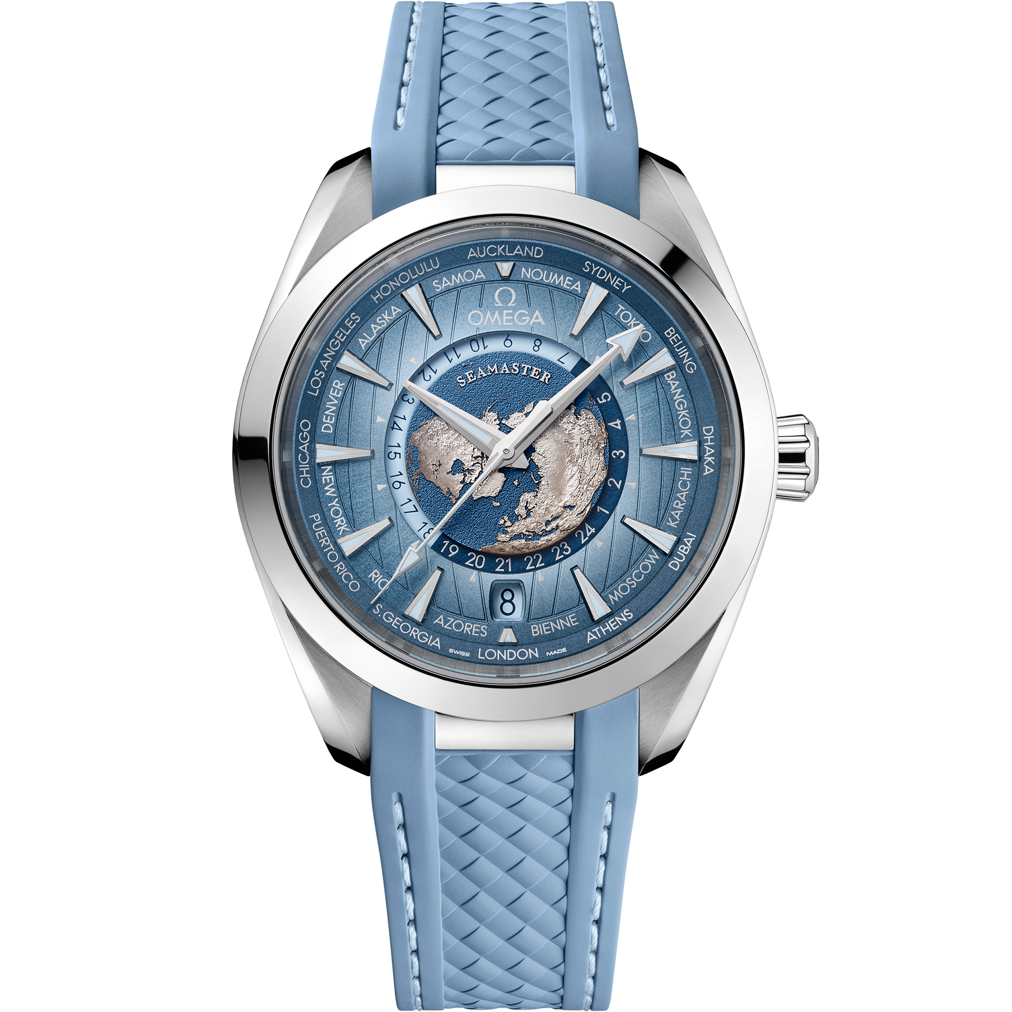 This 43 mm Worldtimer, with its polished and brushed case in stainless steel, has a blue rubber strap, which is integrated into the case and enhanced with a solid polished link.