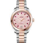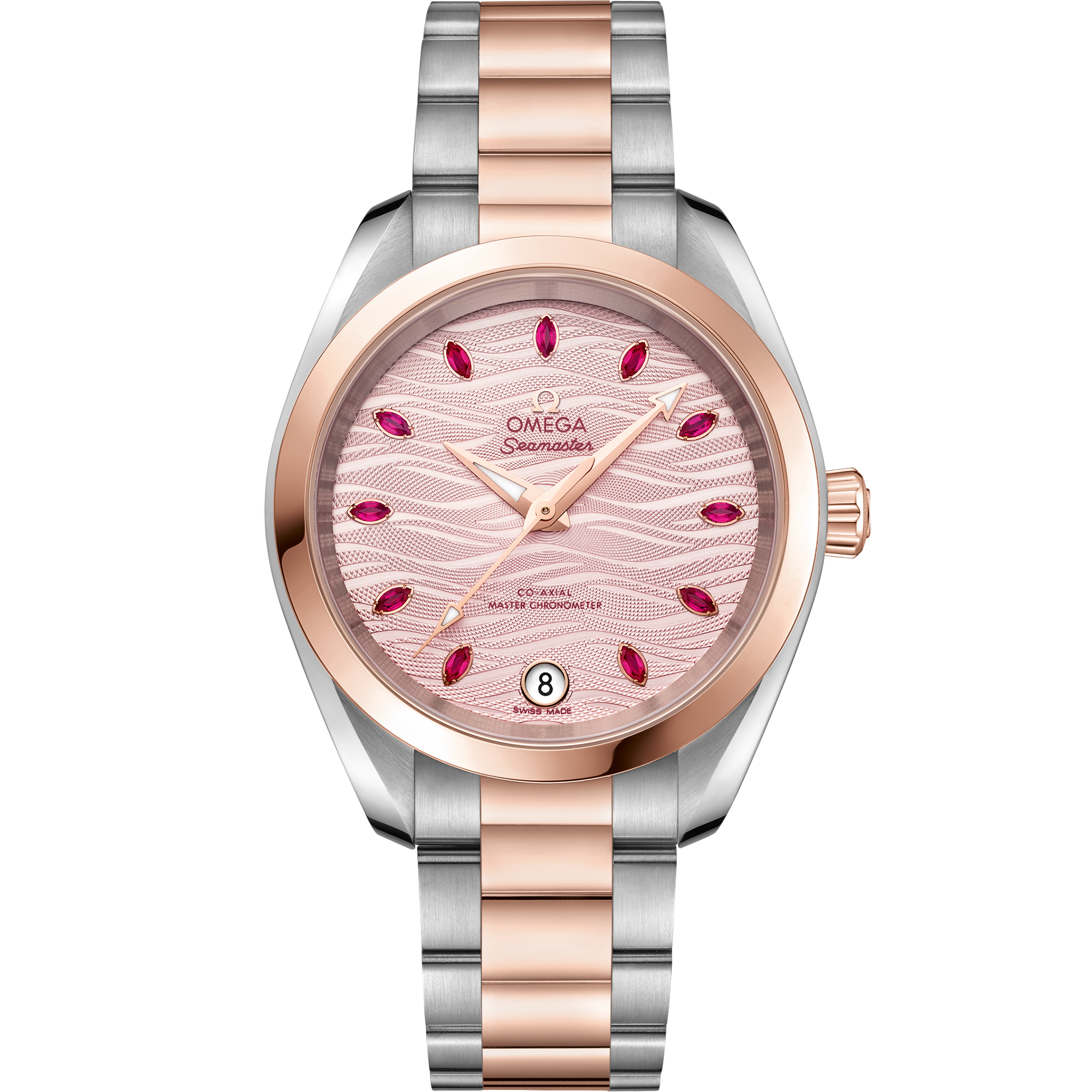 OMEGA's beautiful 34 mm Seamaster has a symmetrical case in stainless steel and 18K Sedna™ gold and a polished bezel. The pale pink wave-embossed dial has central hour/minute and seconds hands in diamond-polished 18K Sedna™ gold, a date window at 6 o’clock and 11 marquise-cut ruby hour markers.