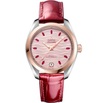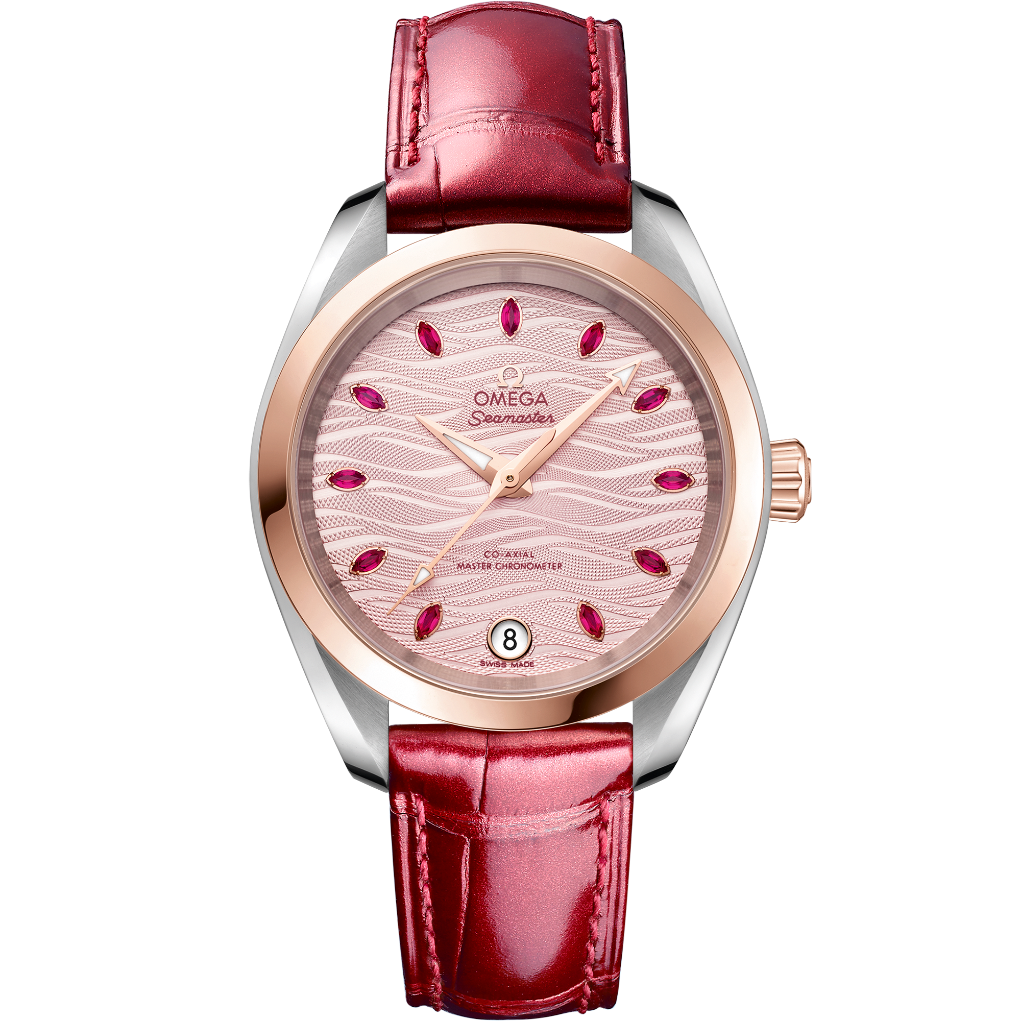 OMEGA's beautiful 34 mm Seamaster has a symmetrical case in stainless steel and 18K Sedna™ gold and a polished bezel. The pale pink wave-embossed dial has central hour/minute and seconds hands in diamond-polished 18K Sedna™ gold, a date window at 6 o’clock and 11 marquise-cut ruby hour markers.