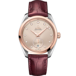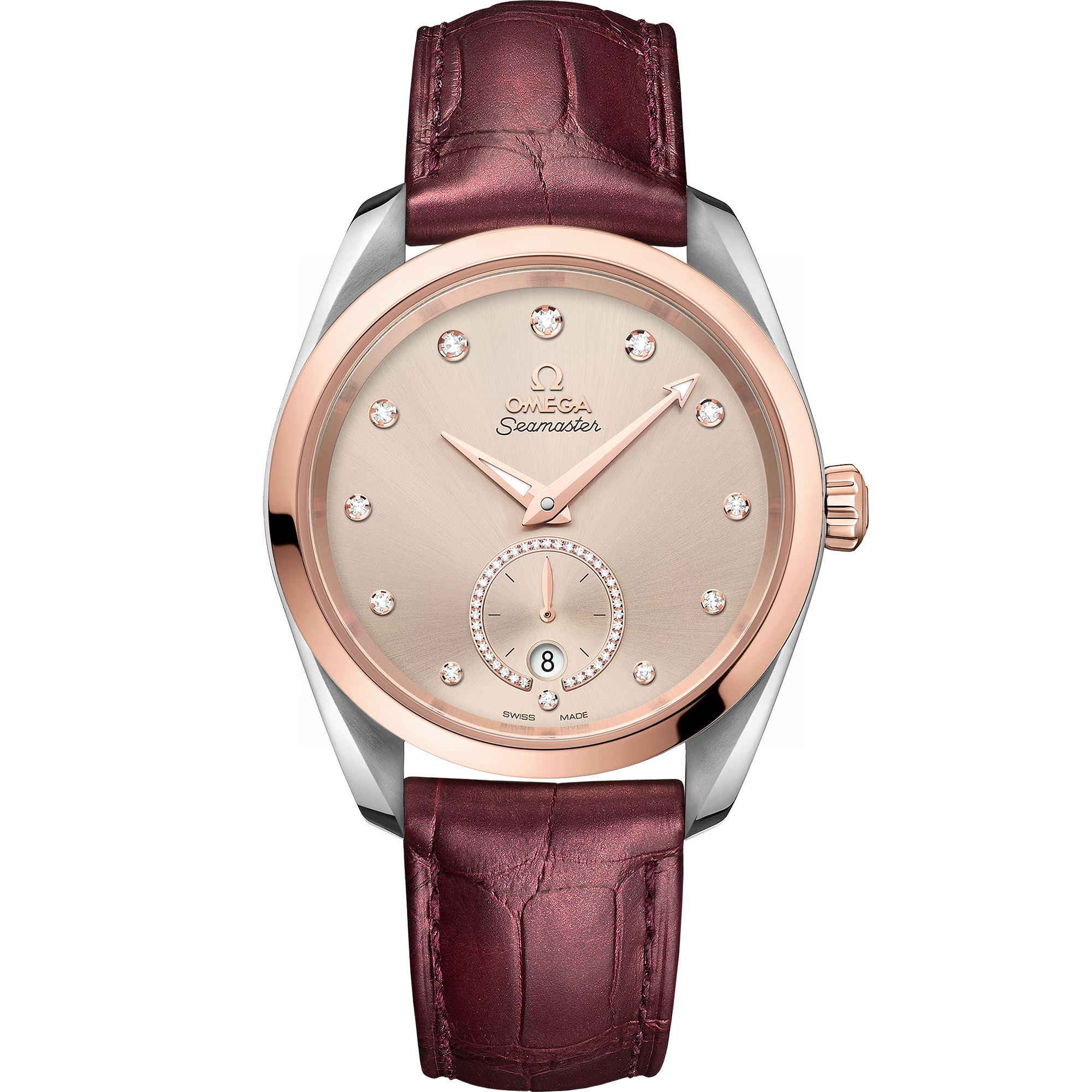 Presented on a burgundy leather strap, this timepiece is powered by the OMEGA Co-Axial Master Chronometer calibre 8802, certified at the industry’s highest standard by the Swiss Federal Institute of Metrology (METAS).