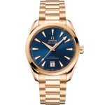 Its sun-brushed PVD colour-treated blue dial has an 18K Moonshine™ Gold OMEGA logo, and date window at 6 o'clock. The hands and hour markers, also in 18K Moonshine™ Gold, are filled with white Super-LumiNova which emits a blue glow.
