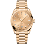 This 38 mm model, crafted in polished 18K Moonshine™ Gold, has a conical crown and wave-edged caseback with flat sapphire crystal. The sun-brushed and lacquered dial in PVD-treated Moonshine™ Gold, features a circular date window at 6 o’clock ringed in 18K Moonshine™ Gold. OMEGA has also used 18K Moonshine™ Gold for the facetted hands and distinctive hour-markers, which are shaped like sailboat hulls and filled with white Super-LumiNova.