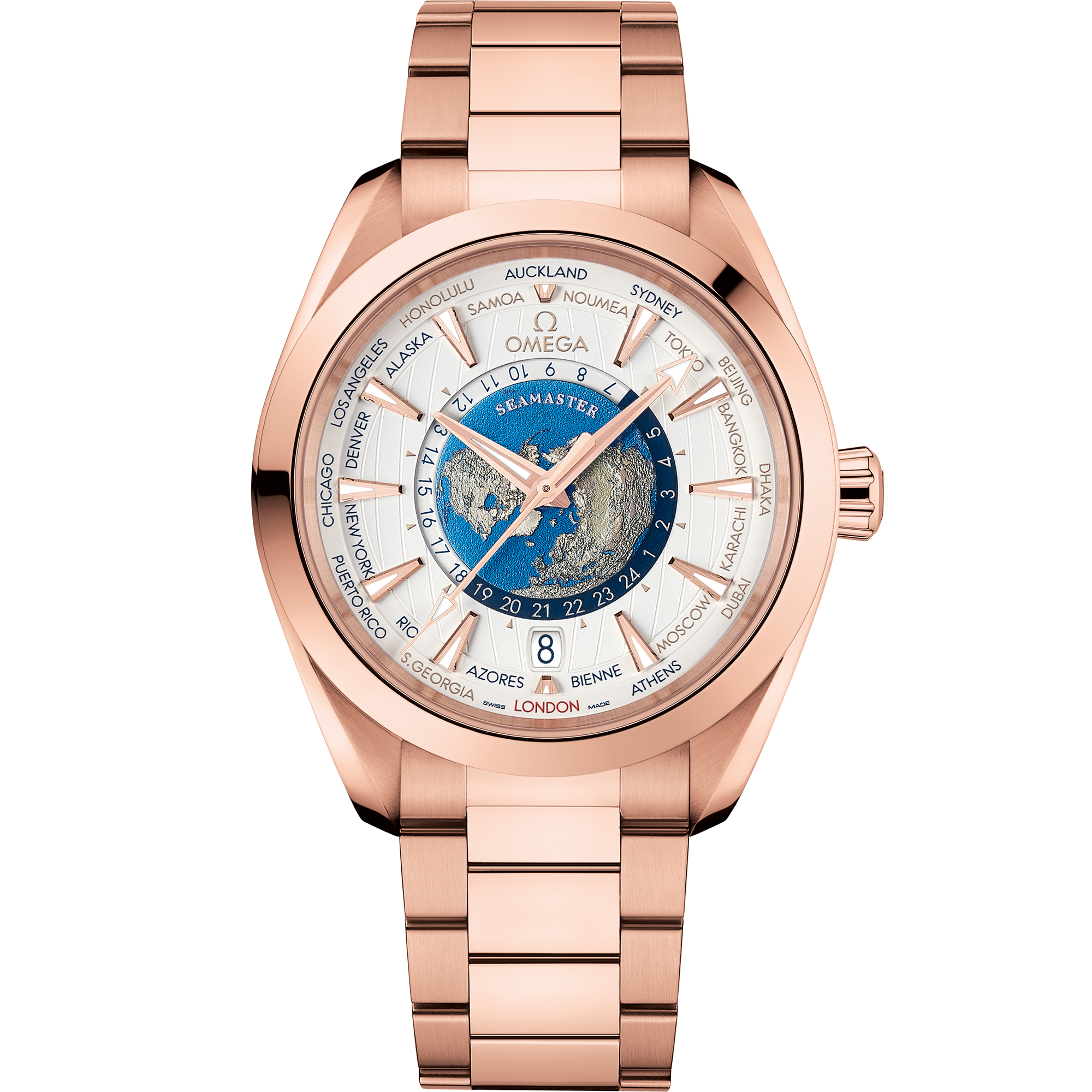 This 43 mm Worldtimer model includes a polished case and bracelet in 18K Sedna™ gold. This is the same material used for the hands and indexes.
