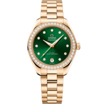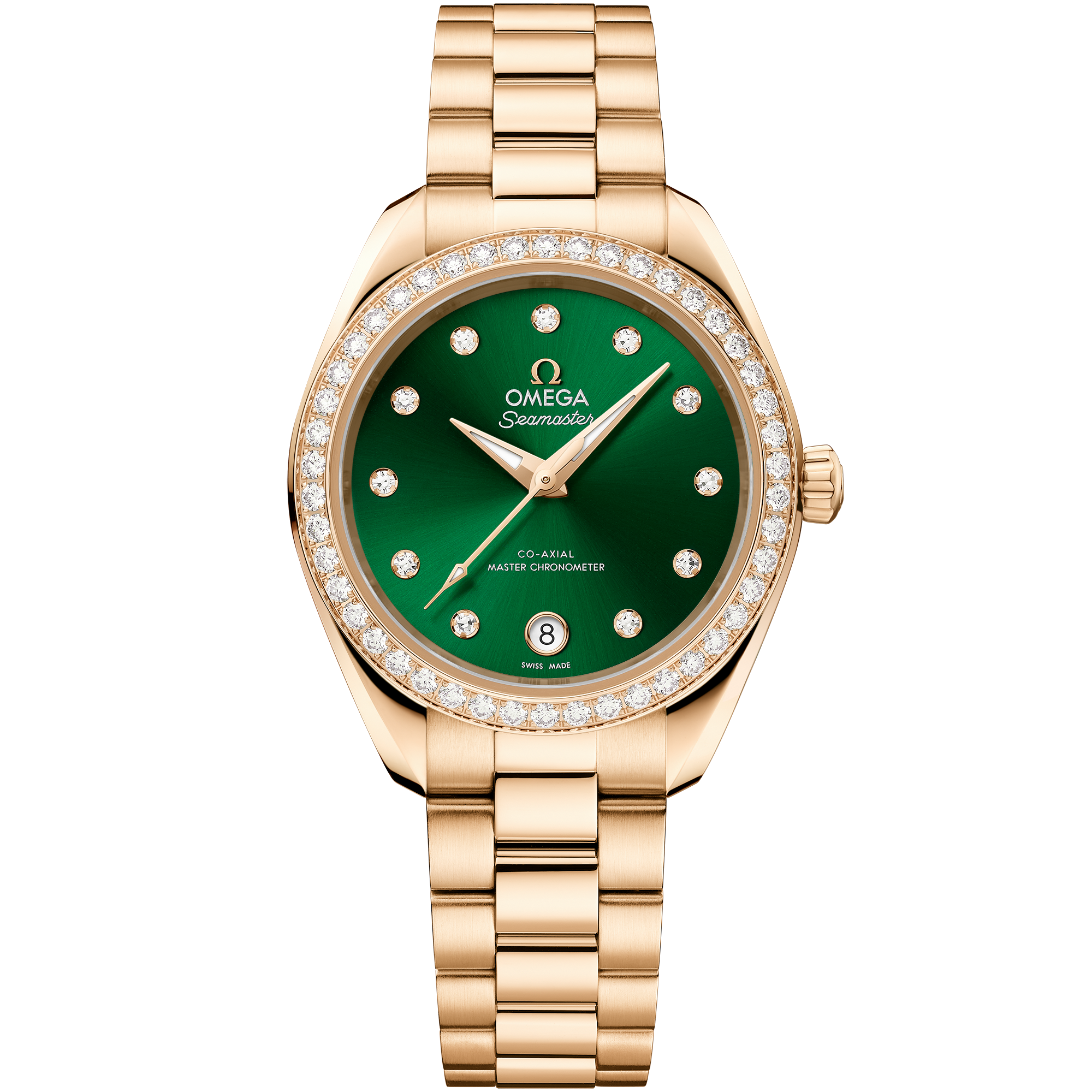 The green dial is sun-brushed and coloured with tinted lacquer, with a circular date window at 6 o’clock. It is highlighted by 11 diamond hour markers and redesigned faceted hands, with the minute hand tapering to a delicate point. All the applied elements are in 18K Moonshine™ Gold, while the hands are crafted in 18K yellow gold with a PVD Moonshine™ Gold coating. The hands also feature white Super-LumiNova which emits a blue glow.