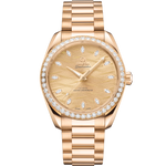 The Seamaster Aqua Terra is a superb tribute to OMEGA’s rich maritime heritage. One of four 38 mm watches celebrating the seasonal colours, this model has a symmetrical case in polished 18K Moonshine™ Gold, a diamond-paved bezel, and a wave-edged design caseback.