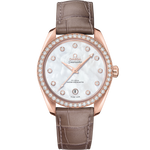 The bezel is diamond-set and the watch is presented on a taupe-brown leather strap with a polished foldover clasp. Driven by the OMEGA Co-Axial Master Chronometer calibre 8801, this wristwatch is certified at the industry’s highest standard by the Swiss Federal Institute of Metrology (METAS).