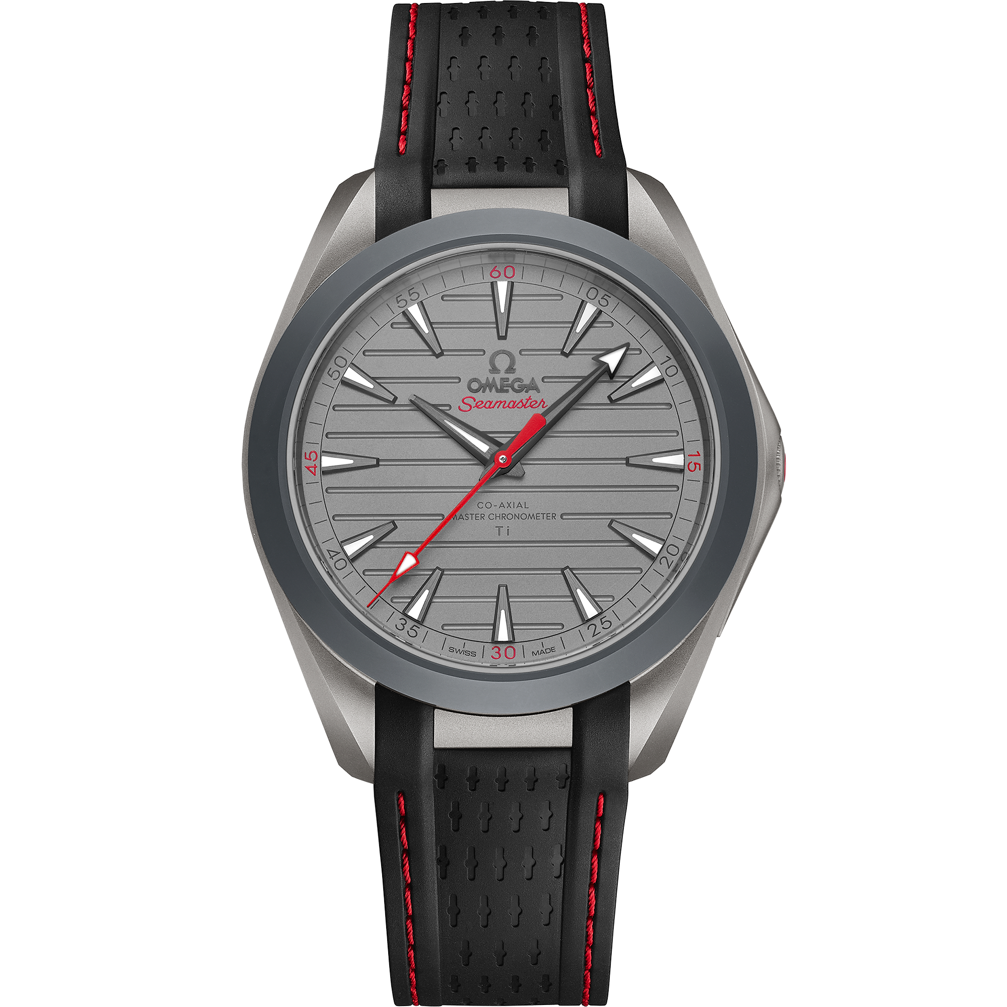 This 41 mm Aqua Terra makes bold use of red on the aluminium seconds hand, Seamaster logo, quarter hour markers and strap stitching. The watch is powered by the OMEGA Co-Axial Master Chronometer Calibre 8928 Ti, the brand's first movement built from titanium.