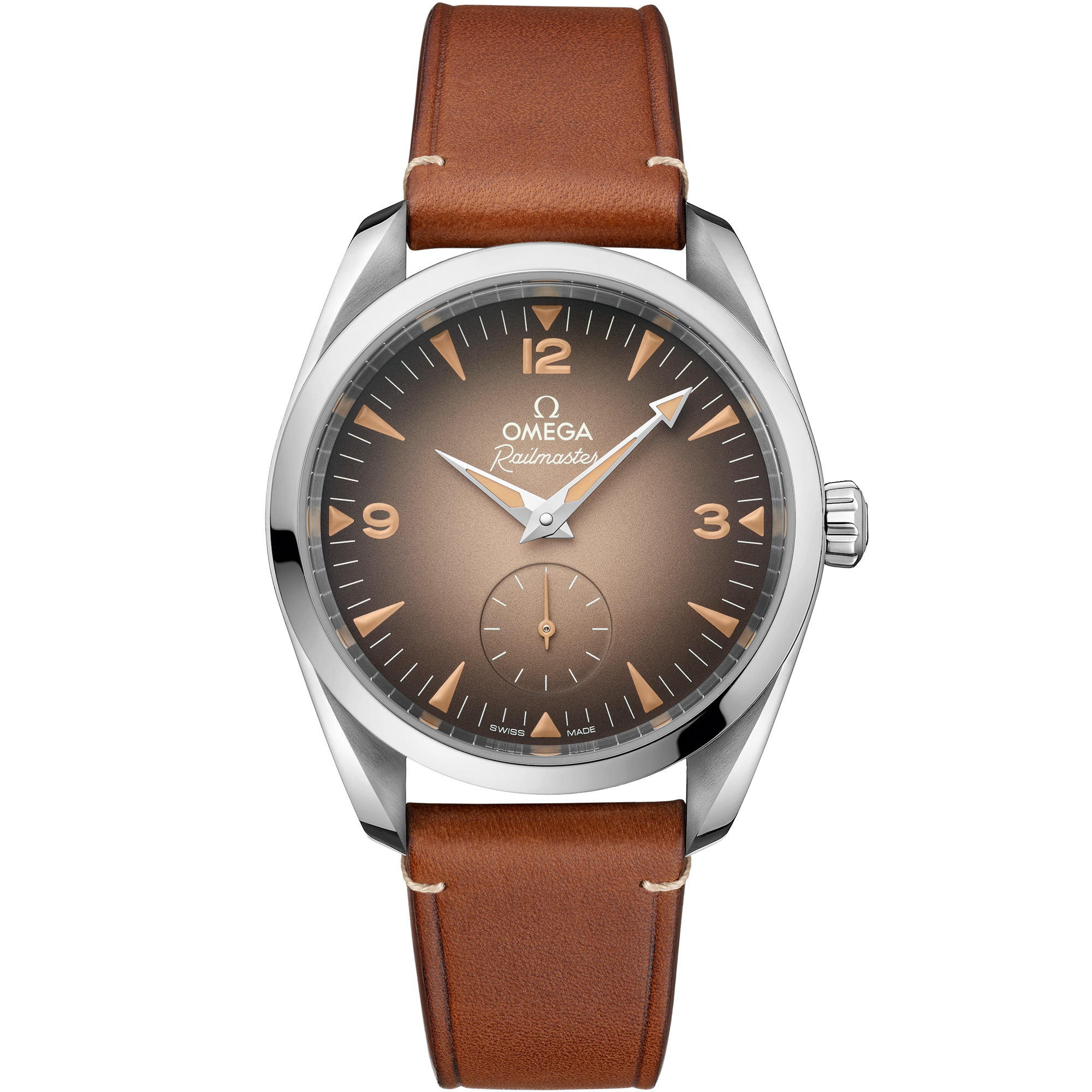 The symmetrical 38 mm case is brushed and polished, and is presented on a golden brown Novonappa leather strap. In keeping with the original Railmaster’s easy-to-read display, the dial of this model is beige with a black gradient, and features large numerals and hour markers in vintage Super-LumiNova. There is also a Small Seconds display placed at 6 o’clock, which includes a beige varnished hand.