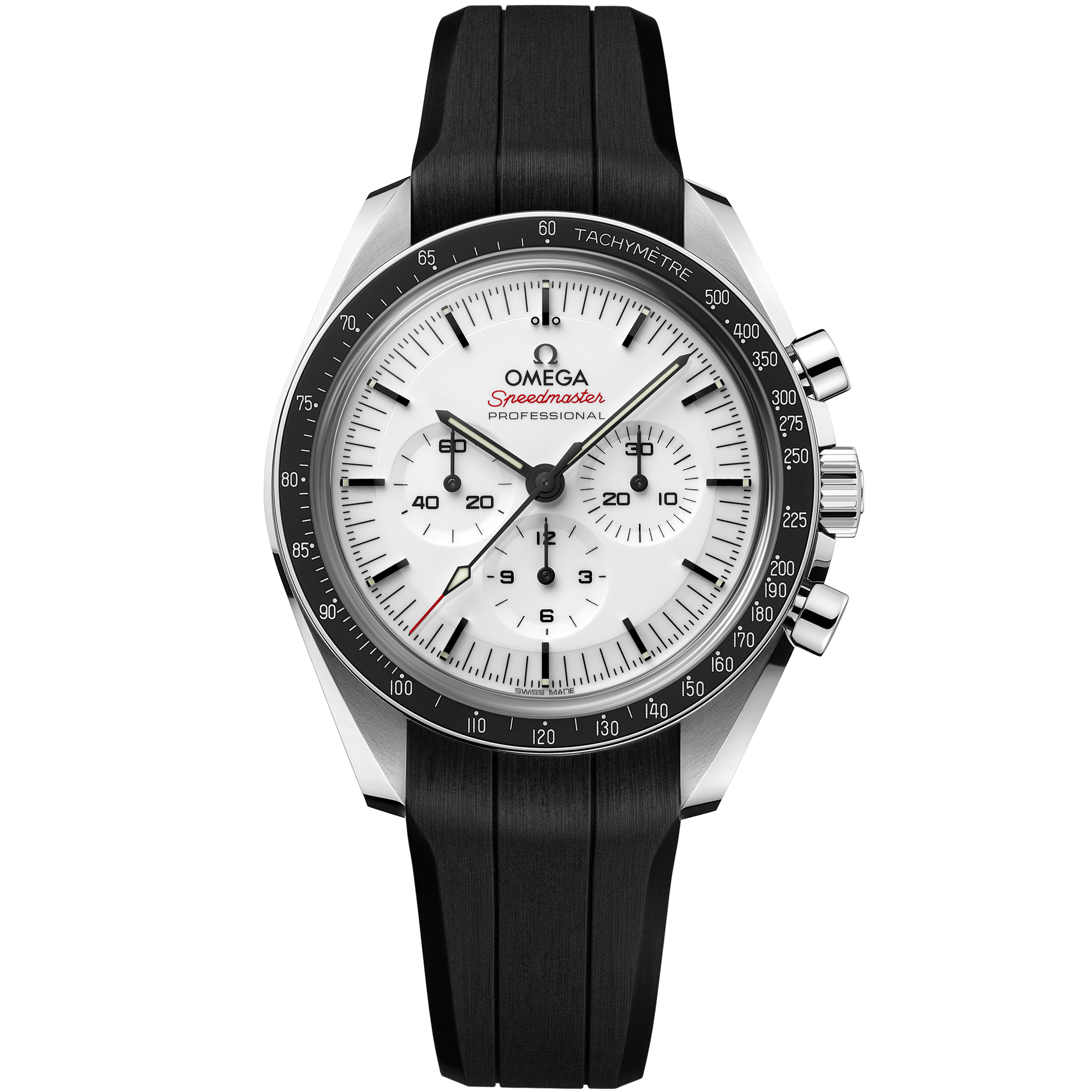 This 42 mm Moonwatch in stainless steel features sapphire crystal glass on the front as well as on the caseback. Inspired by the 4th generation Speedmaster style worn on the moon, it also includes an asymmetrical case, a white lacquered step dial with applied OMEGA logo and indexes, Moonwatch style hands, and the famous dot over 90 on the black anodised aluminium bezel ring.