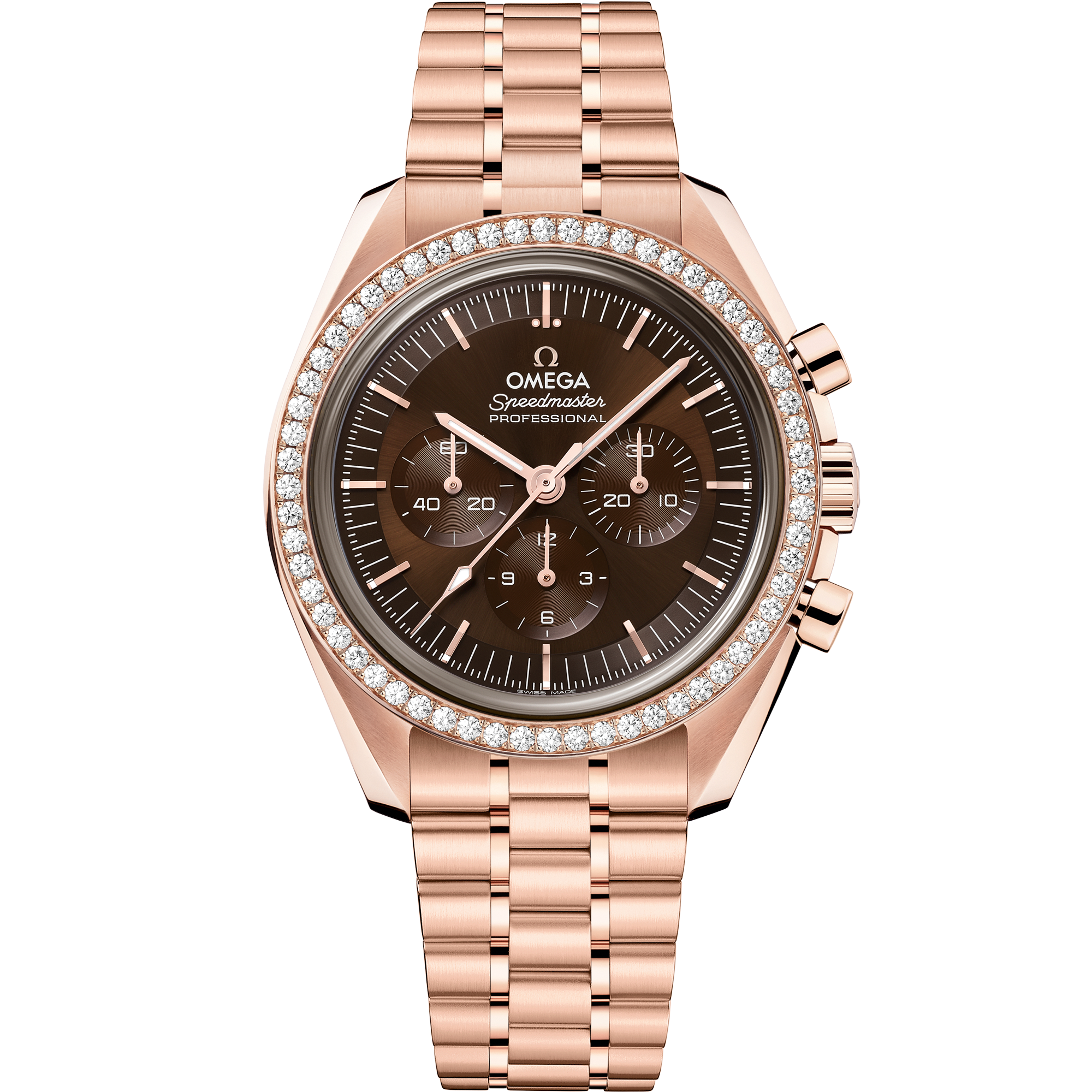 Presented on a five-arched-links-per-row bracelet, this 42 mm Moonwatch in 18K Sedna™ Gold features sapphire crystal glass on the front as well as on the caseback. Inspired by the 4th generation Speedmaster style worn on the moon, it also includes a brown step dial and an asymmetrical case with diamond-paved bezel.