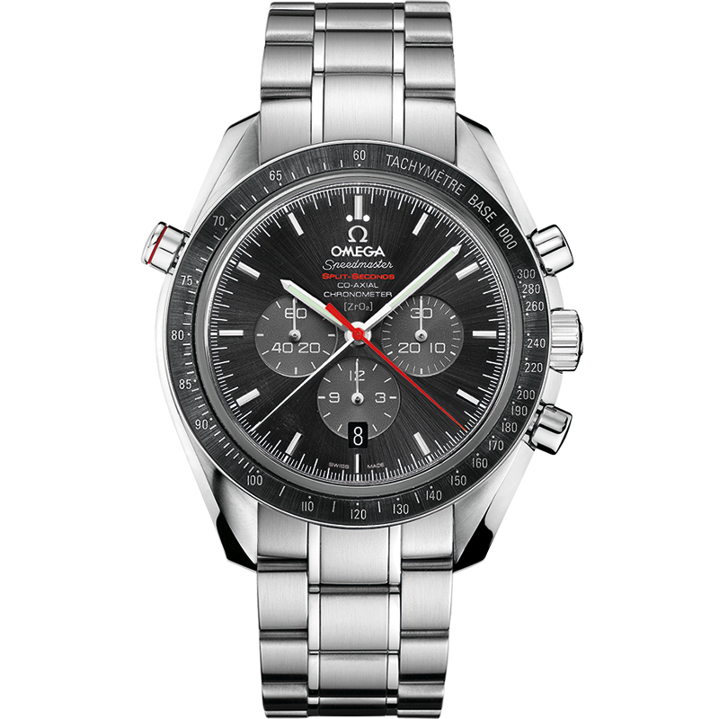 The black ceramic bezel, with its tachymetric scale, is mounted on a 44.25 mm stainless steel case and presented on a stainless steel bracelet. At the heart of this timepiece is the Co-Axial calibre 3612, visible through the transparent caseback.