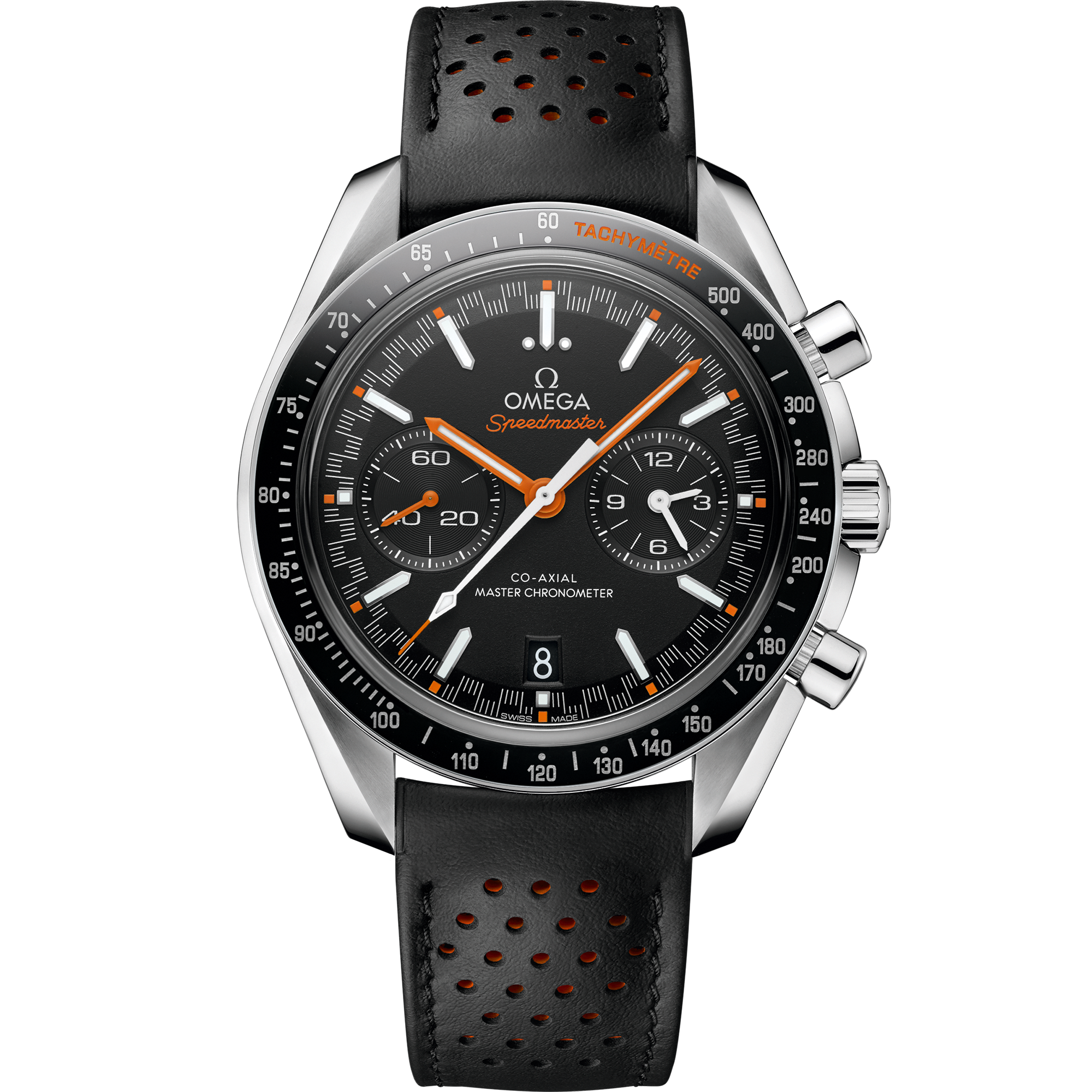 This Speedmaster Racing Master Chronometer model features a 44.25 mm stainless steel case with a black ceramic bezel ring that includes the famous tachymeter scale in orange wording and Liquidmetal™ numbers. The black leather strap is micro-perforated revealing an orange rubber interior.