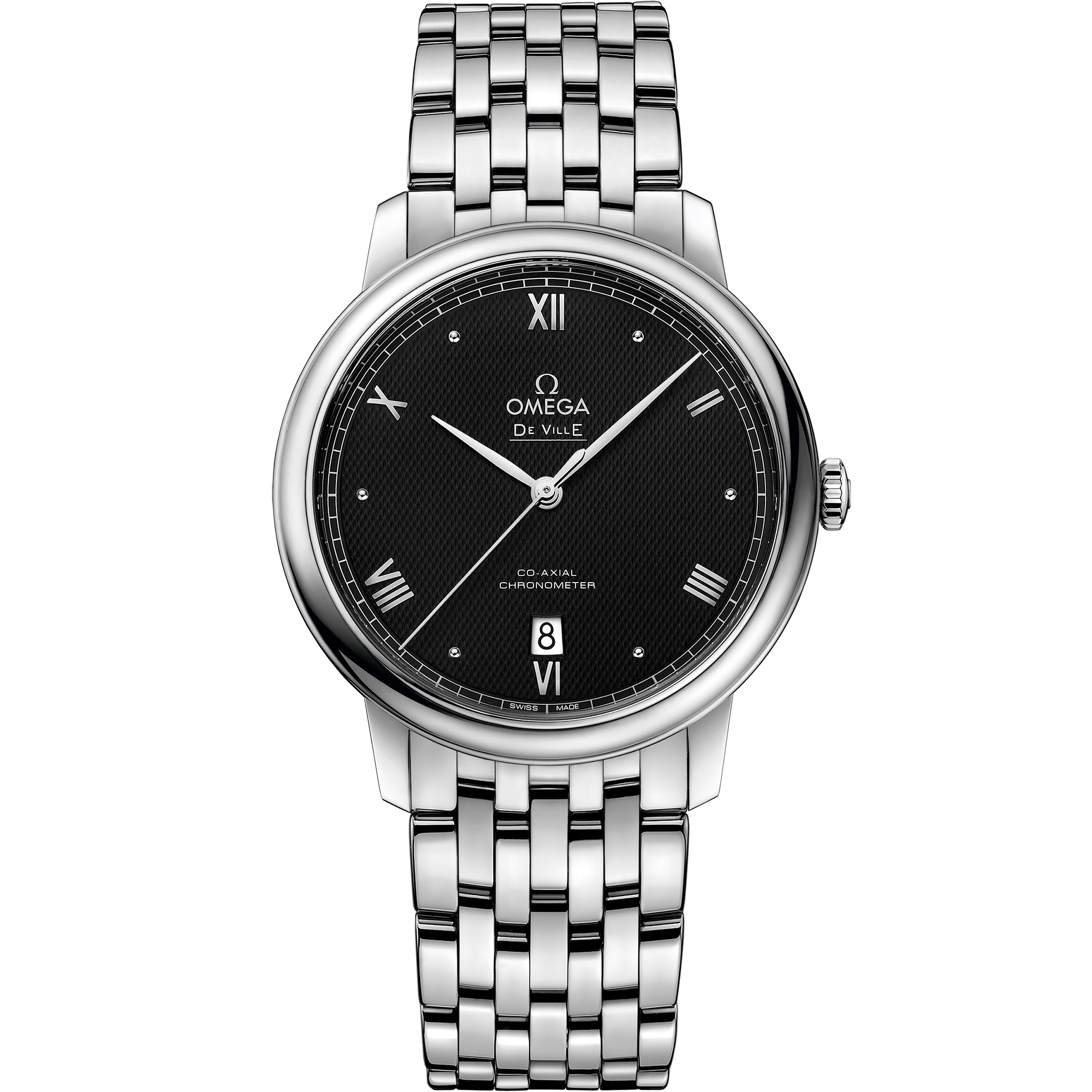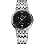 The patterned black dial features rhodium-plated hour-markers and hands, a transferred Ω and date window at 6 o'clock. Marking the moments beneath the domed scratch-resistant sapphire crystal are leaf-shaped hour and minute hands with rounded tips.