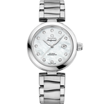 The attractive dial is made with white pearled, mother-of-pearl, to accentuate the feminine touch.