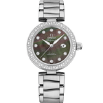 Radiating around the Tahiti mother-of-pearl dial, the bezel is also paved with snow-set diamonds, and an extra "Brilliant OMEGA cut" diamond has been placed within the polished crown.