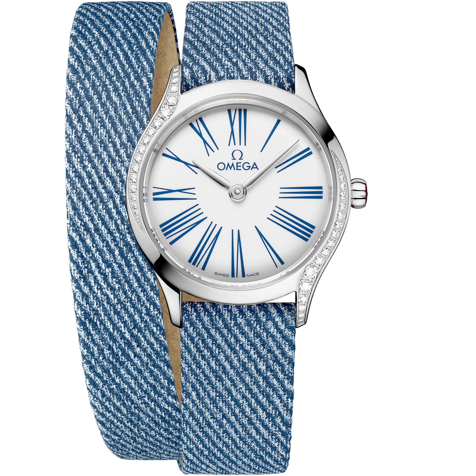 The watch is presented on a double-tour blue calfskin leather strap with a jeans pattern and a Trésor buckle. It is driven by the OMEGA calibre 4061, which sits behind a special mirrored caseback with a metallised “Her Time” pattern.