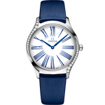 The slim 36 mm case is made from stainless steel and features diamond paving that curves along each side, as well as a crown that is polished with red "HyCeram" and set with a single diamond. The lacquered white dial includes unique transferred Roman numerals in blue and elegant blued hands.