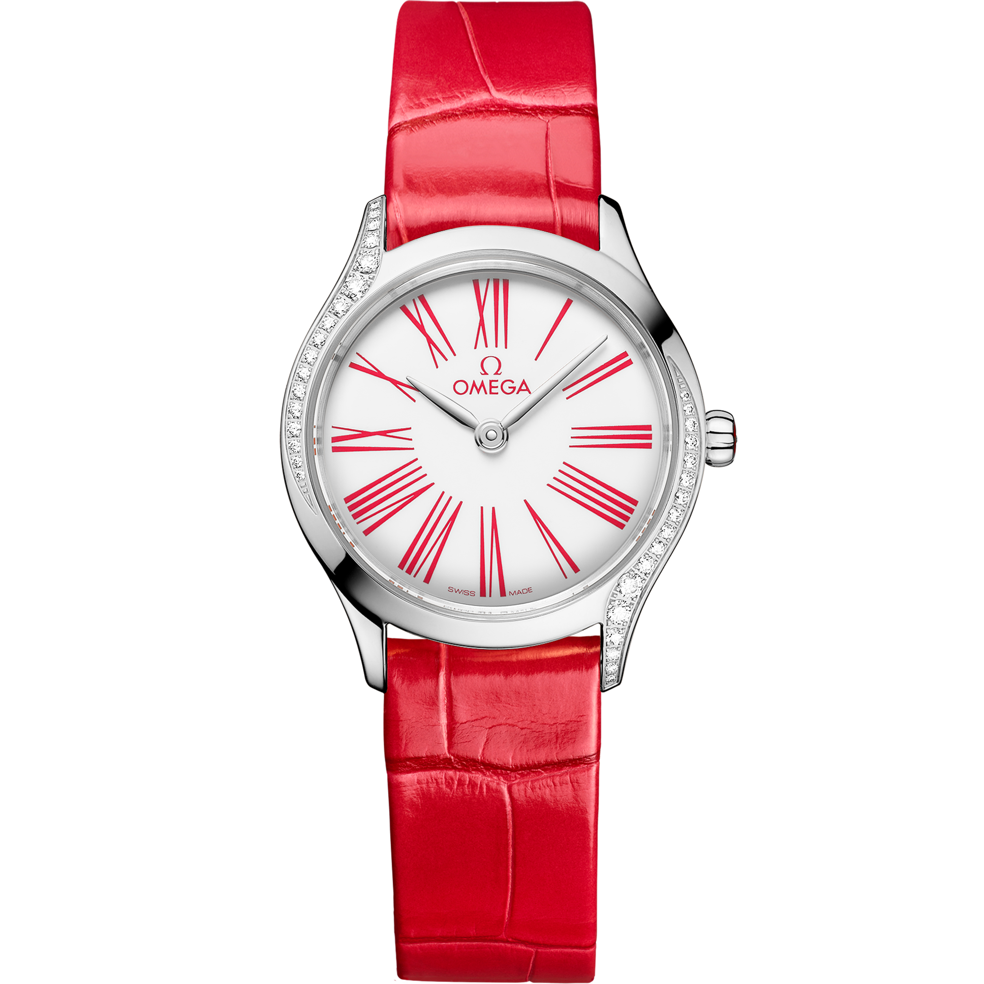 The watch is presented on a lacquered red alligator leather strap with a Trésor buckle. It is driven by the OMEGA calibre 4061, which sits behind a special mirrored caseback with a metallised “Her Time” pattern.